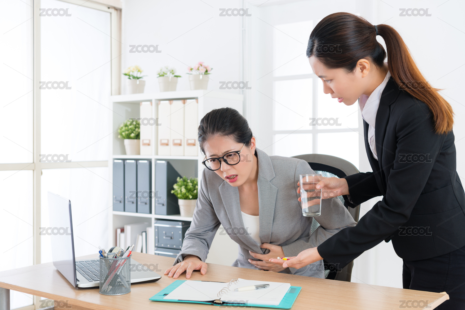 美丽性感的女人领袖越来越胃肠炎疾病痛苦的感觉和年轻漂亮的女助手给她的治疗药。