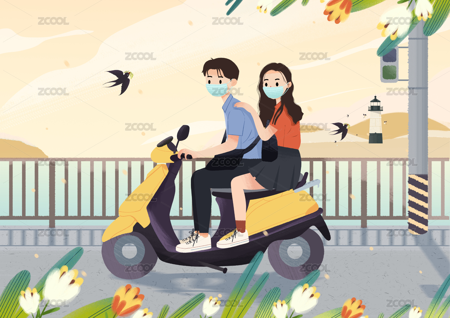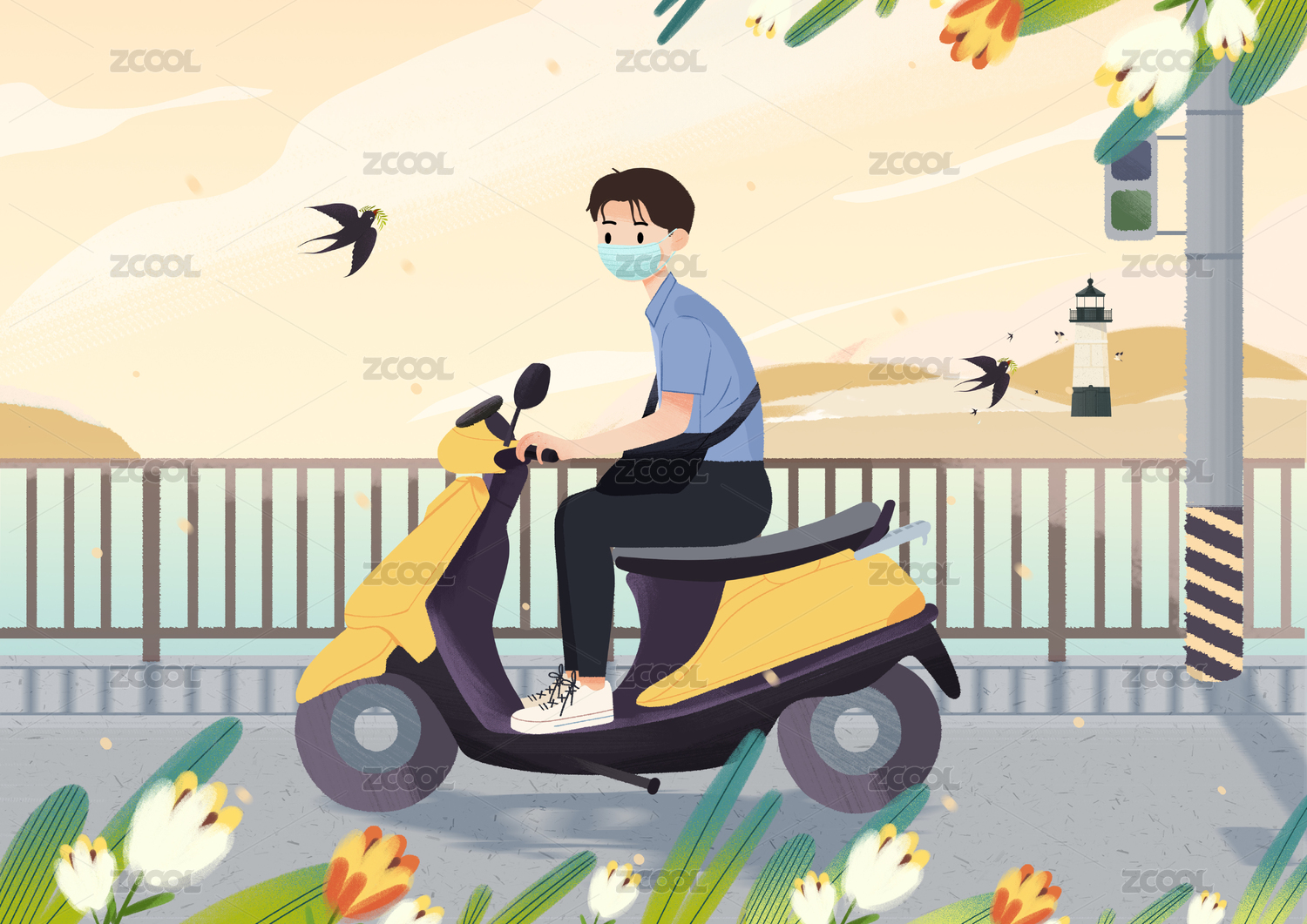 外卖小哥骑着电瓶车路上身后放出烟花横板