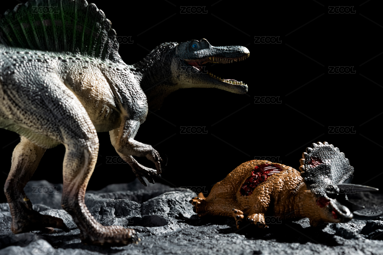 陨石坑旁的棘龙与三角龙尸体