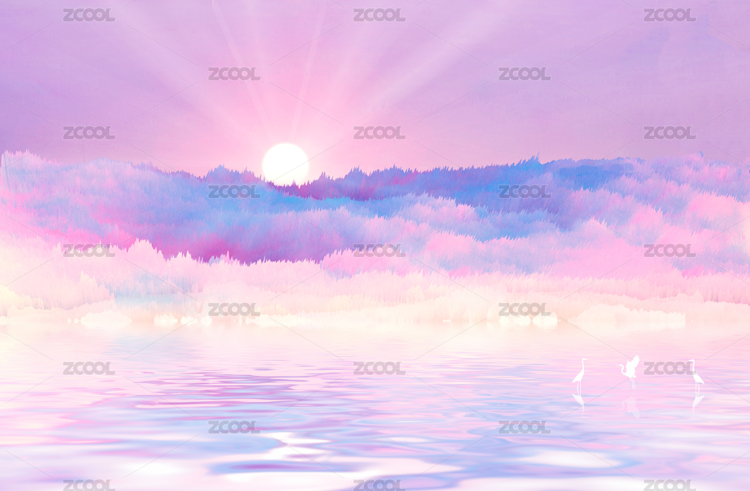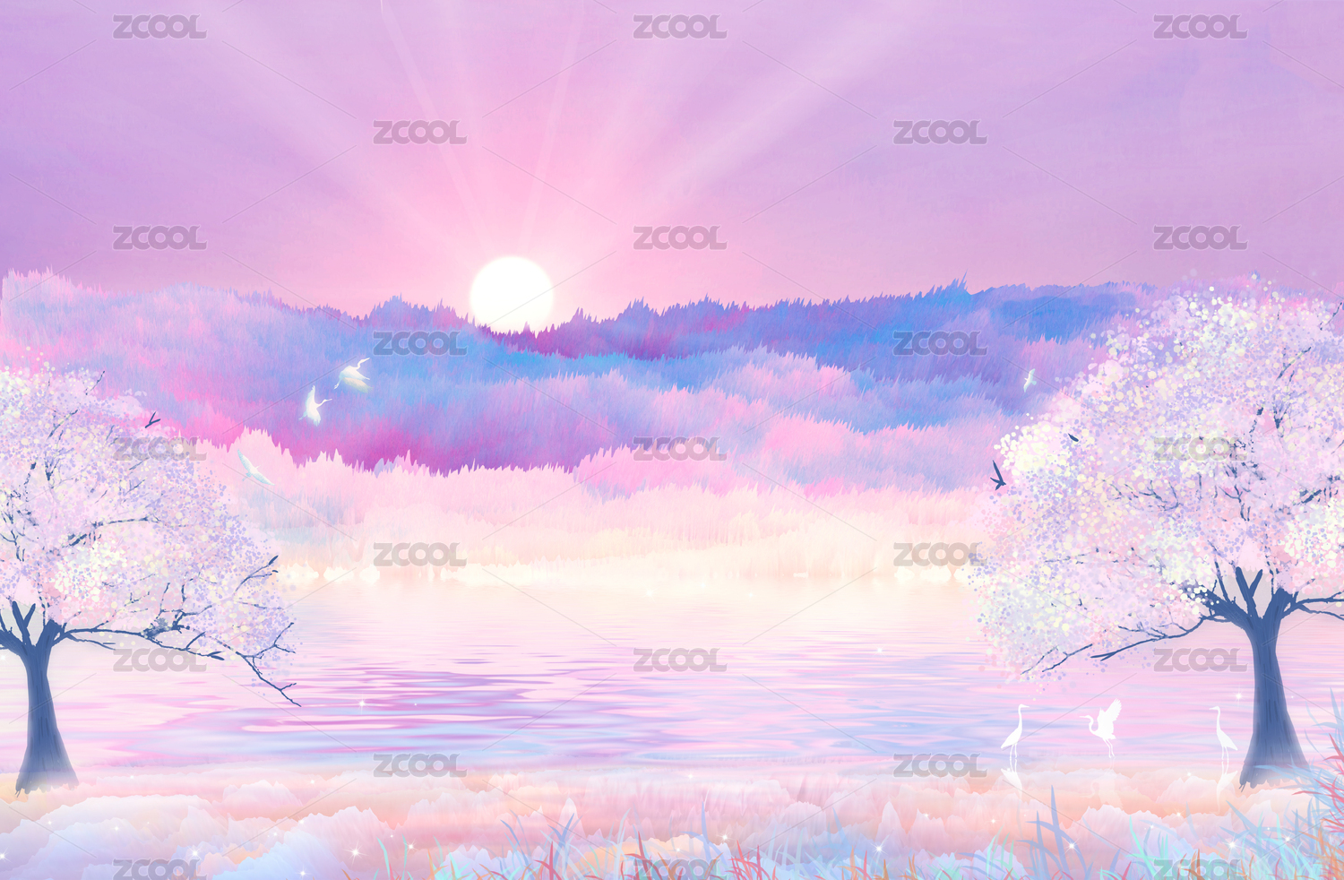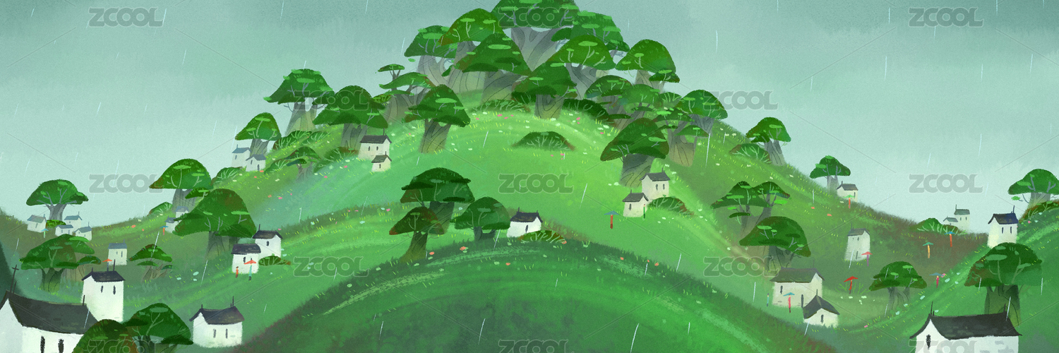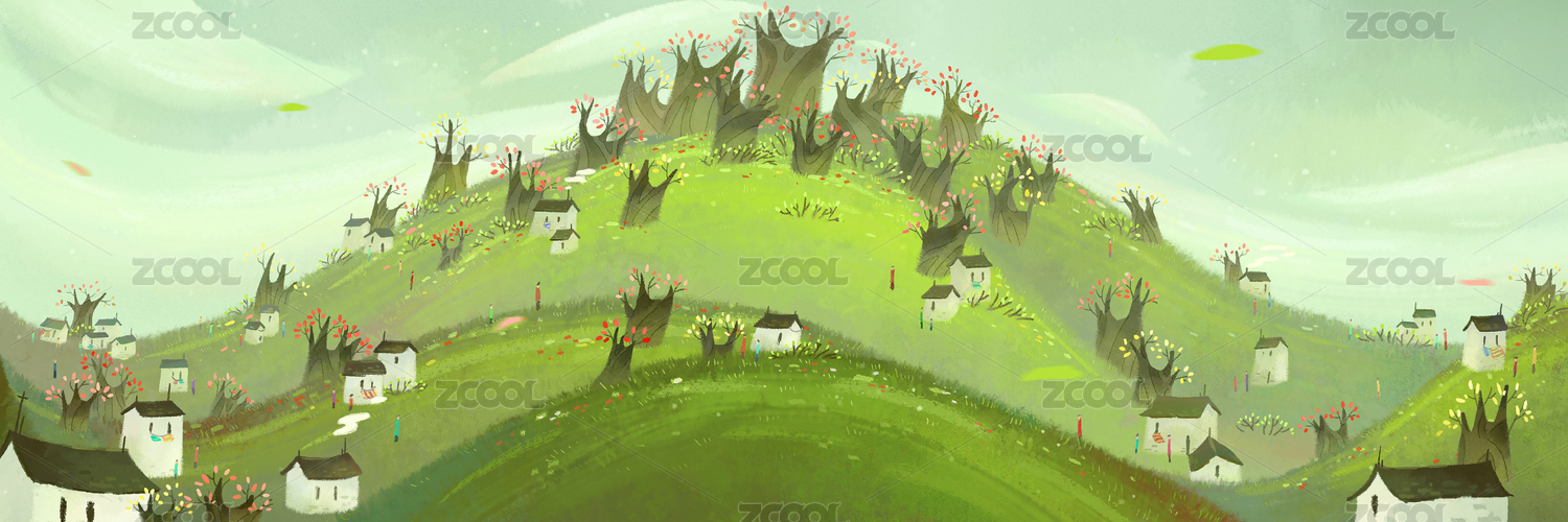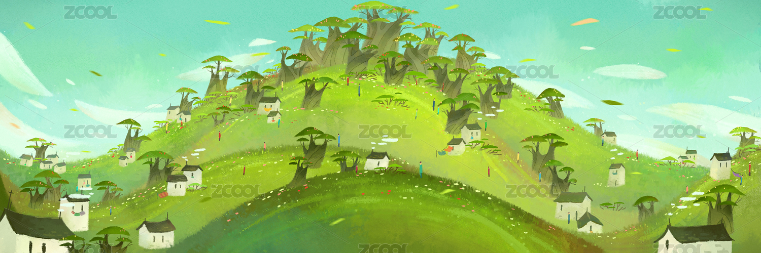 早晨太阳出来了照耀着整片森林,小山坡旁的河流在缓缓流动插画背景海报
