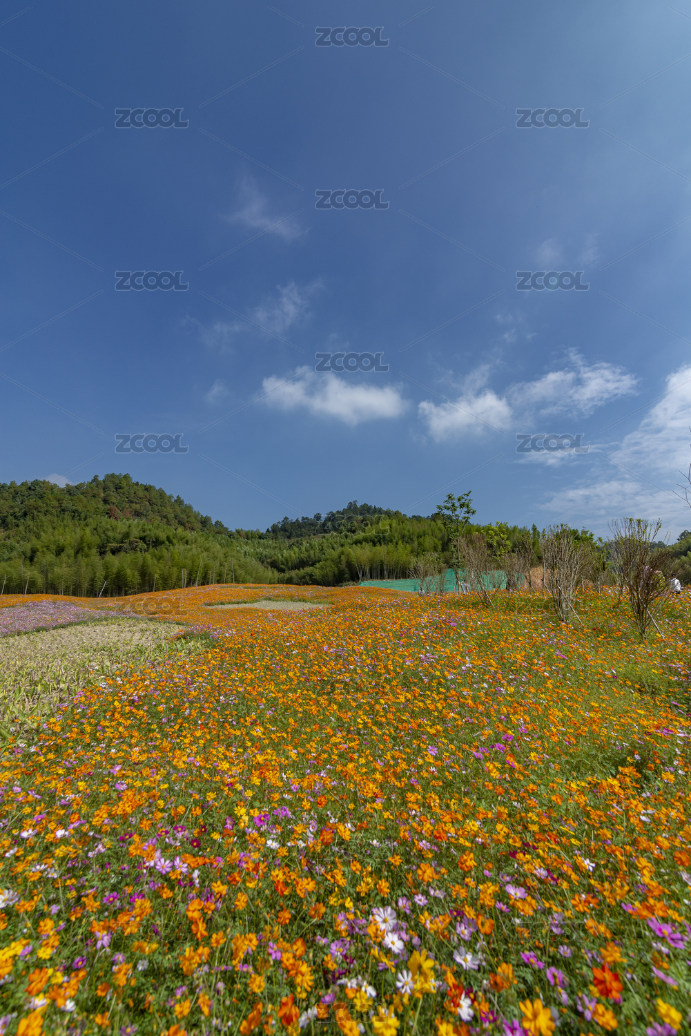 中国福建山脚下开满五颜六色格桑花的小山坡