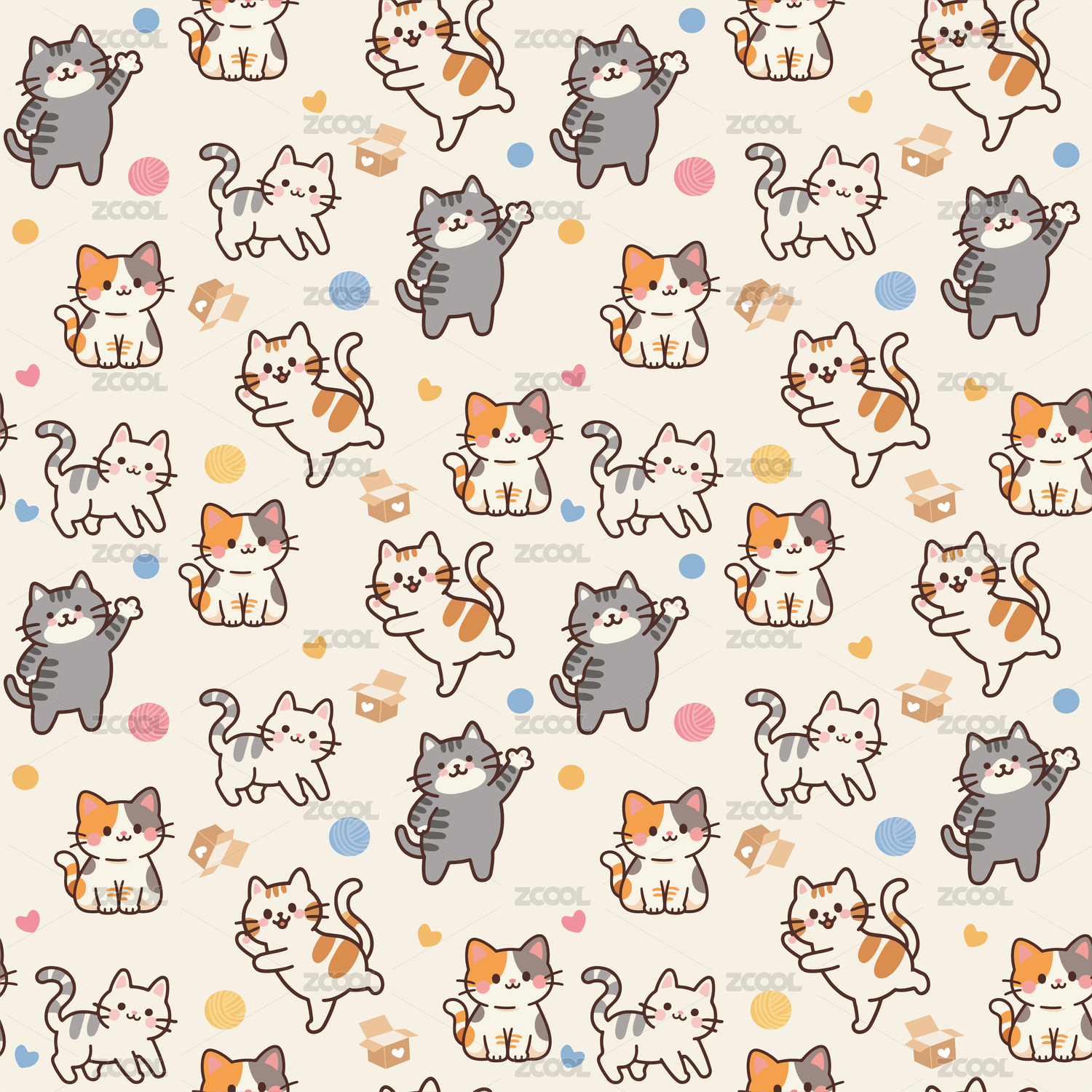 可爱猫咪卡通无缝图案背景插画