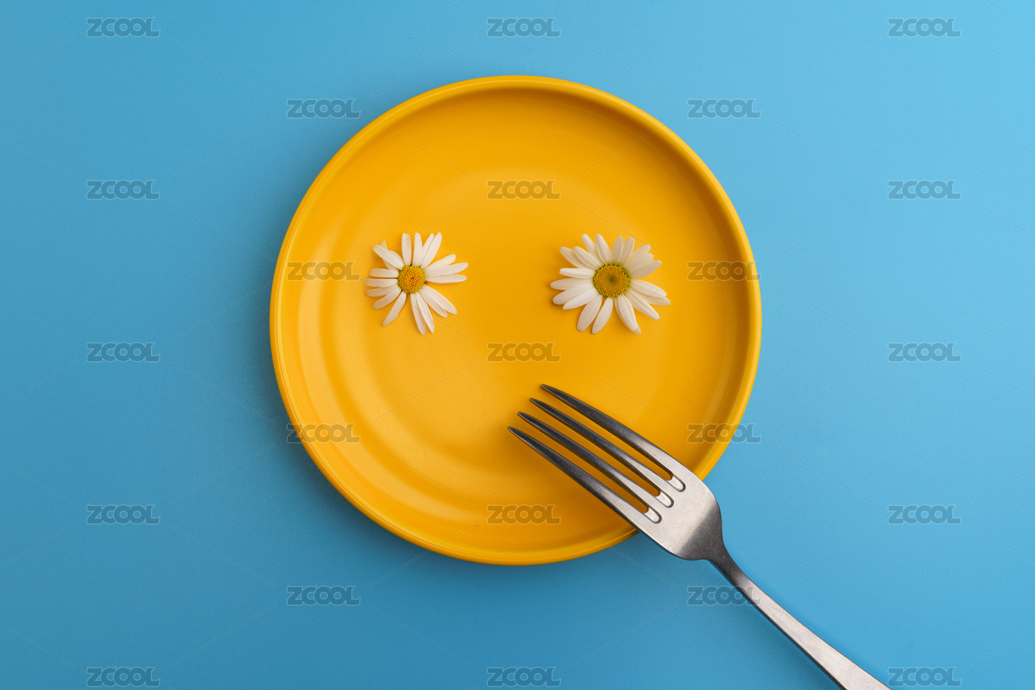 蓝色背景中黄色盘子中的雏菊组成的笑脸创意