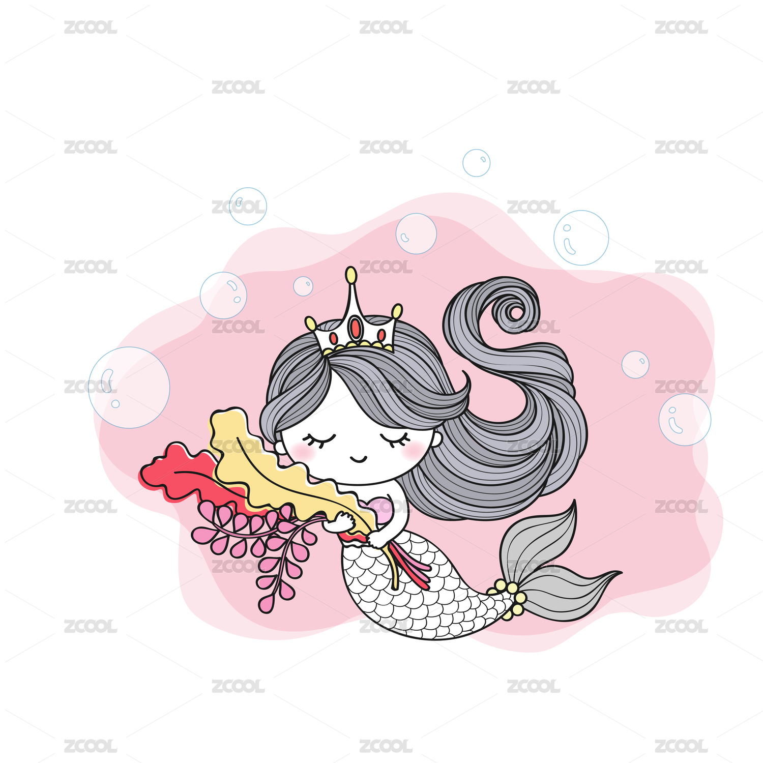可爱的人鱼公主抱着粉红色水草