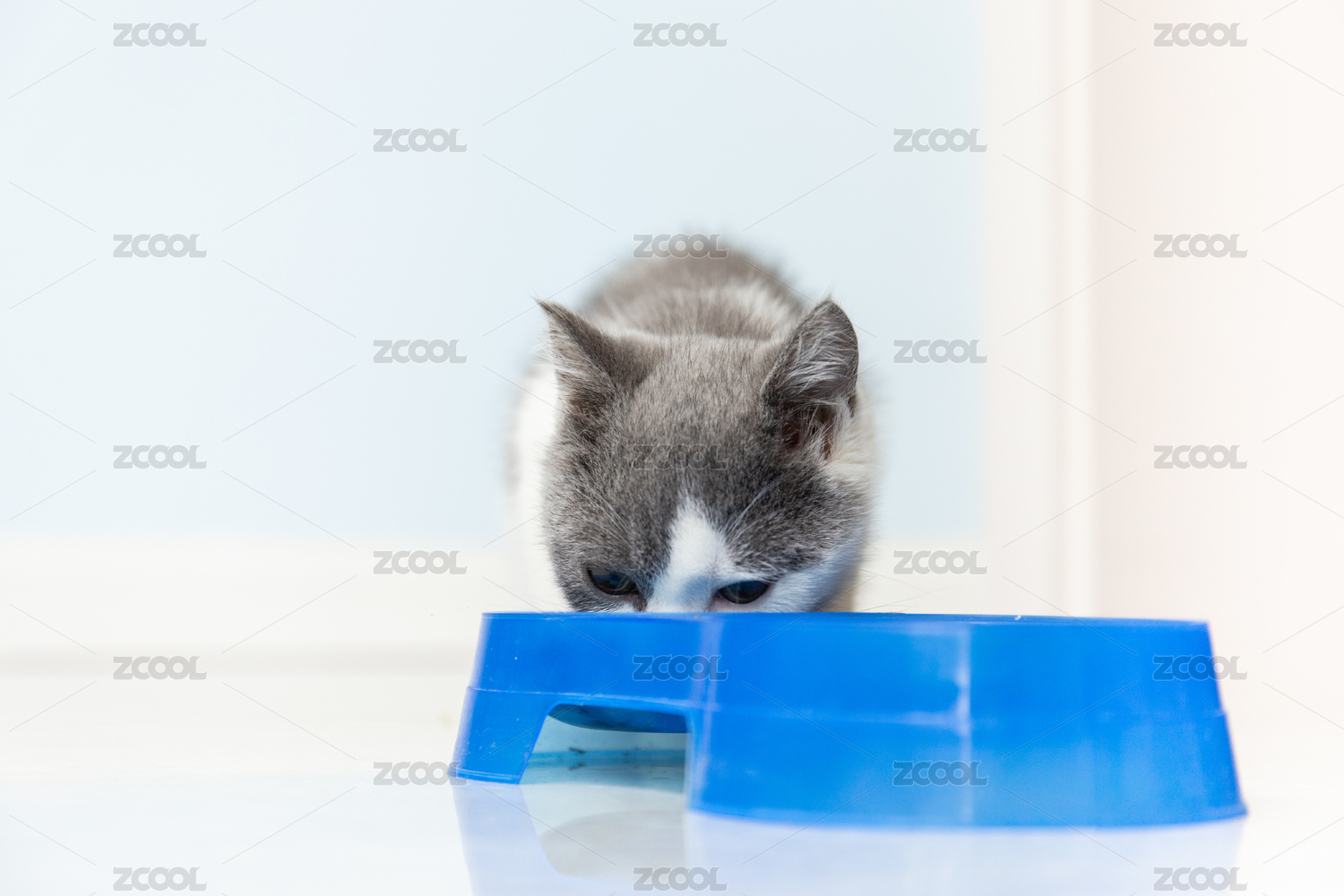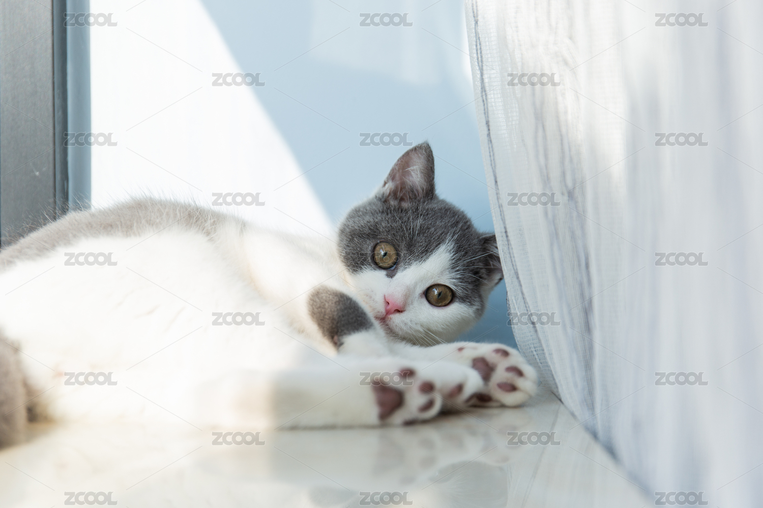 一只可爱的英短蓝白猫在家中的窗台上玩耍