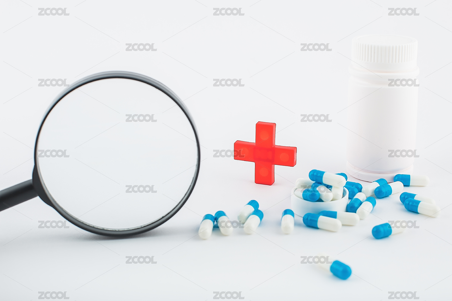 白色背景纸上放着蓝白色胶囊和白色药瓶。