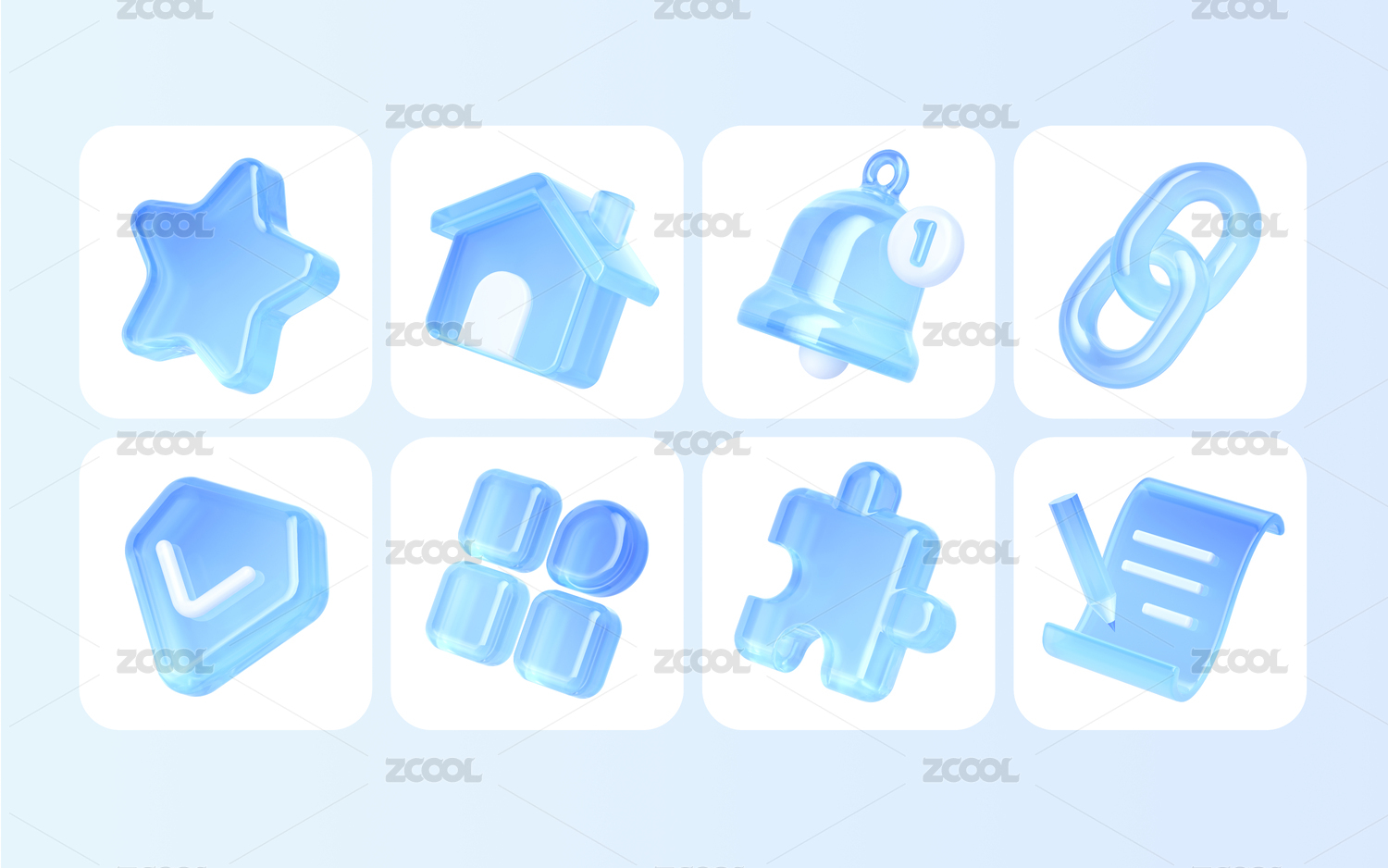 蓝白色透明磨砂玻璃娱乐3D图标合集