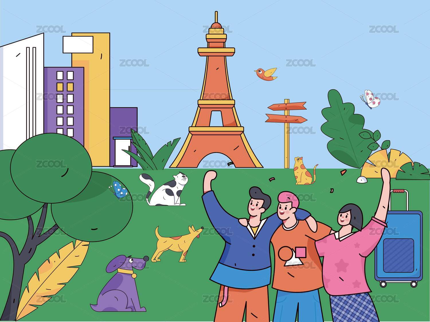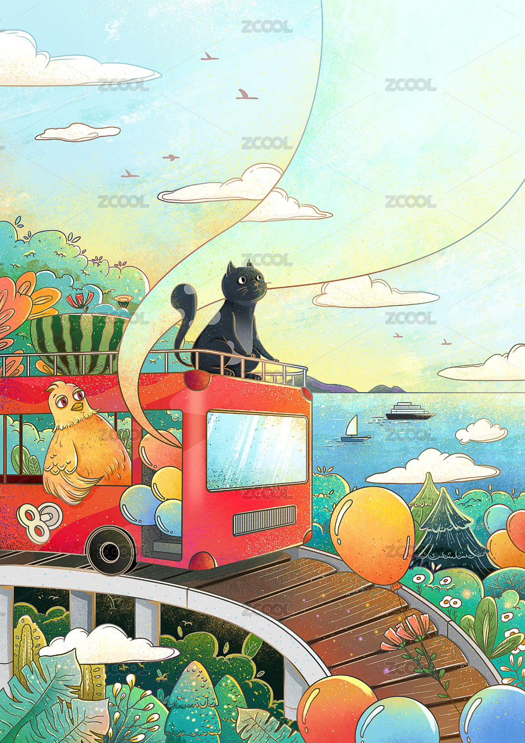 坐着观光车的猫和鸡