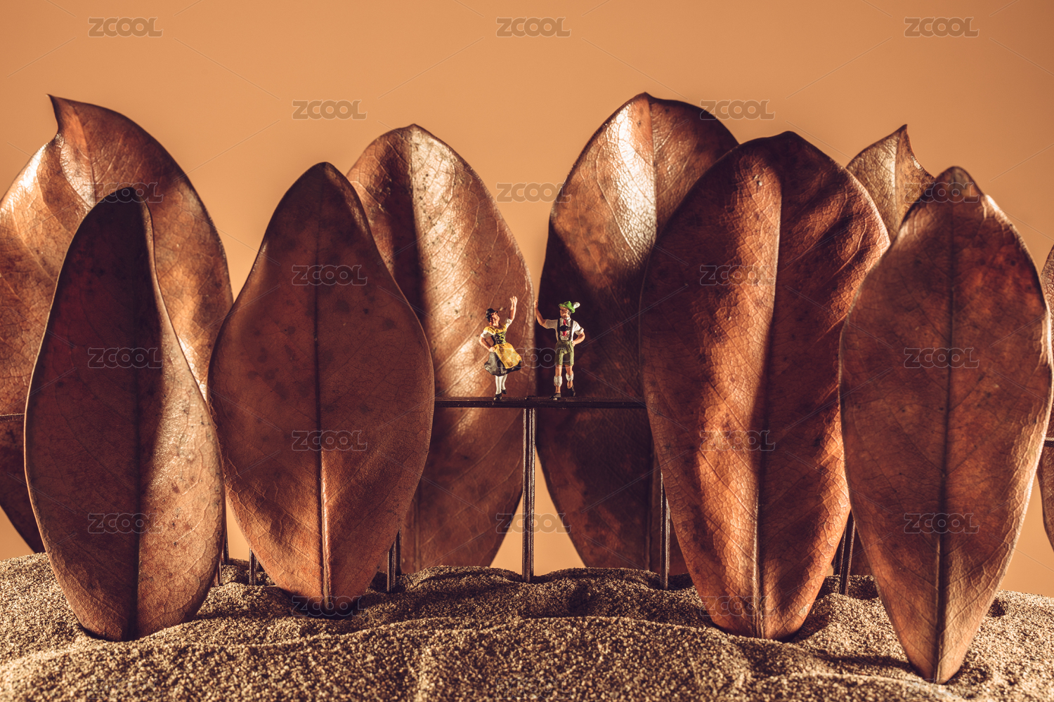 纯色背景人们在枯叶组成的树林里休闲观光