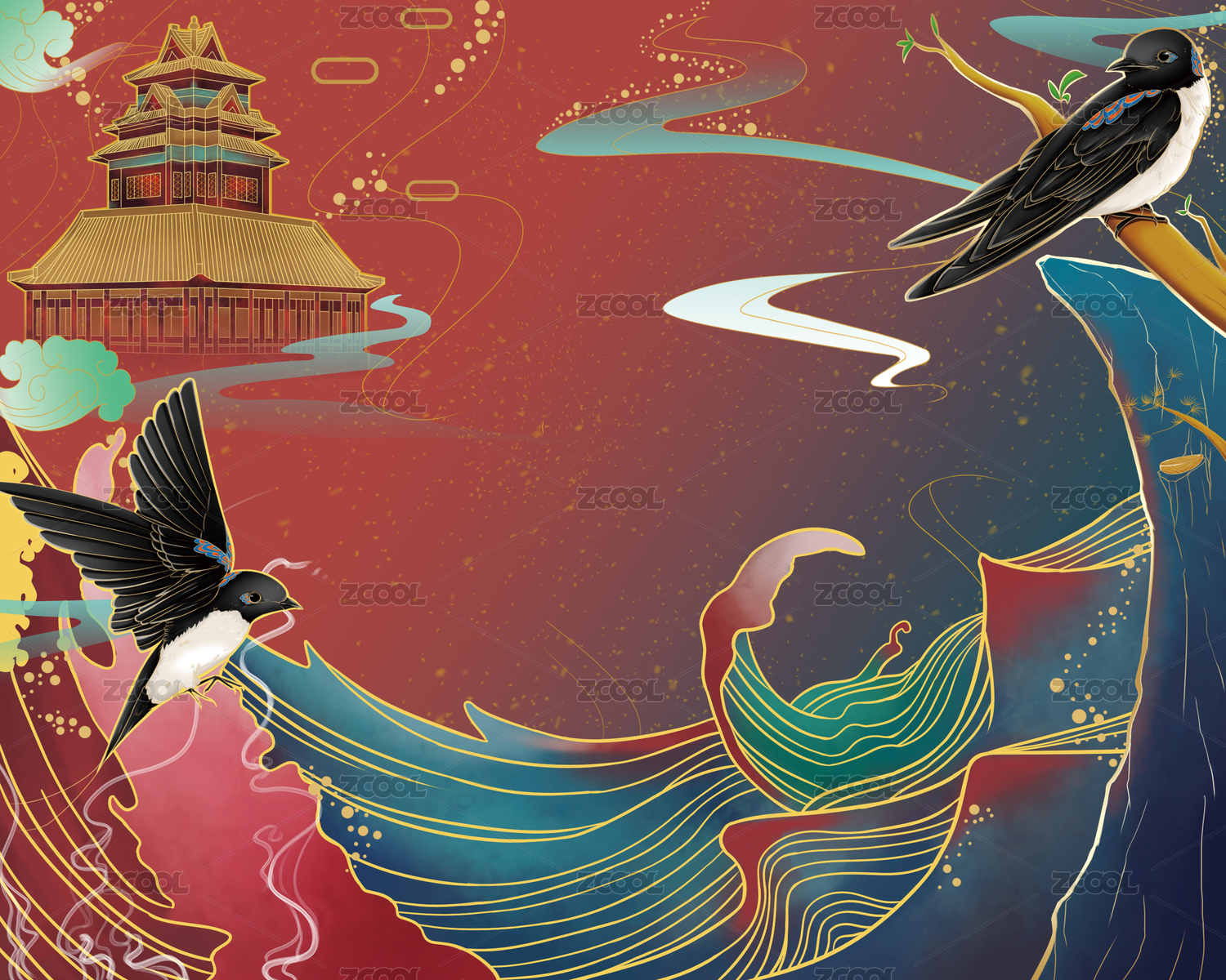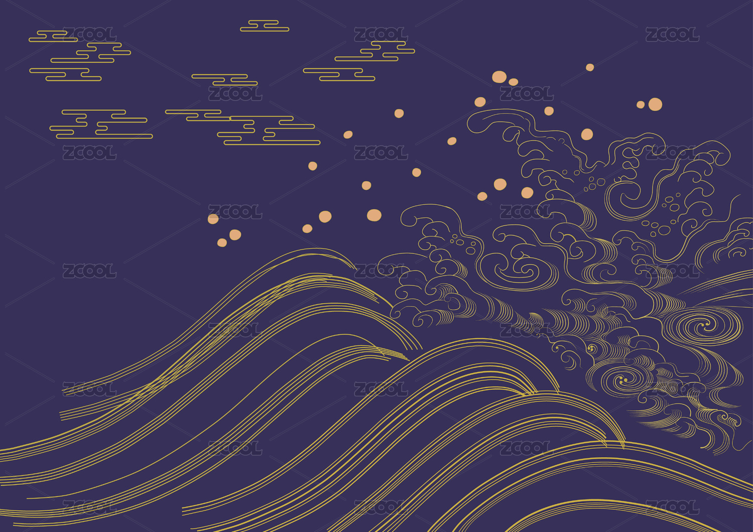 白虎站在浪潮中的高山上背后烈火燃烧国潮