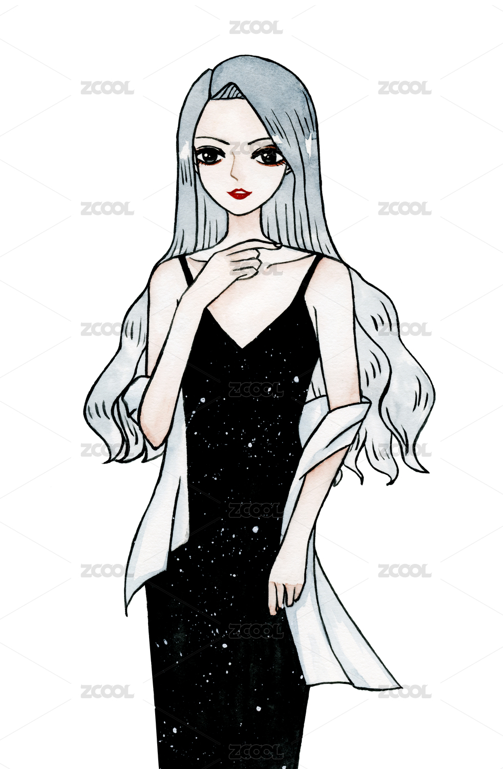 穿着黑色晚礼服的长发少女手绘水彩插画