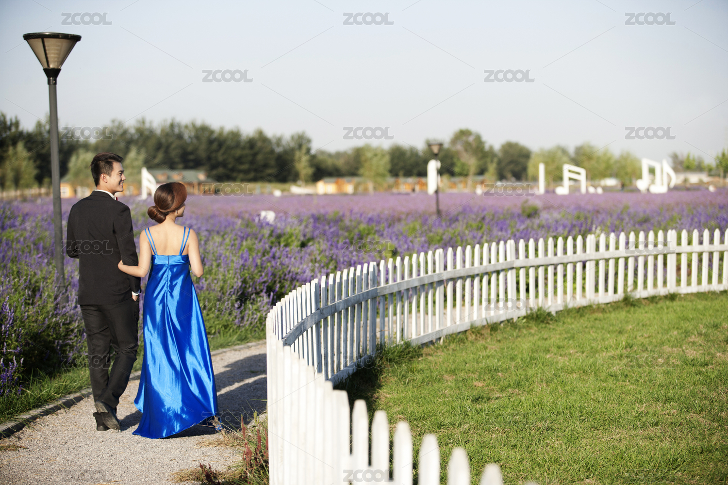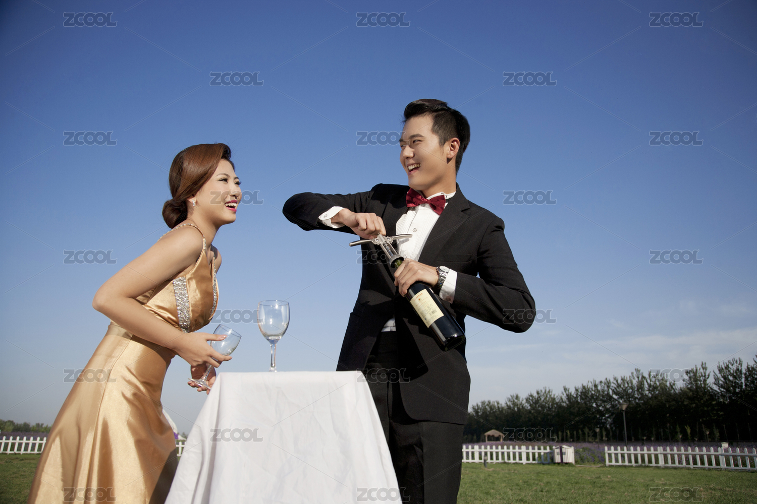 穿着的年轻男人和女人的晚礼服时尚的私人花园