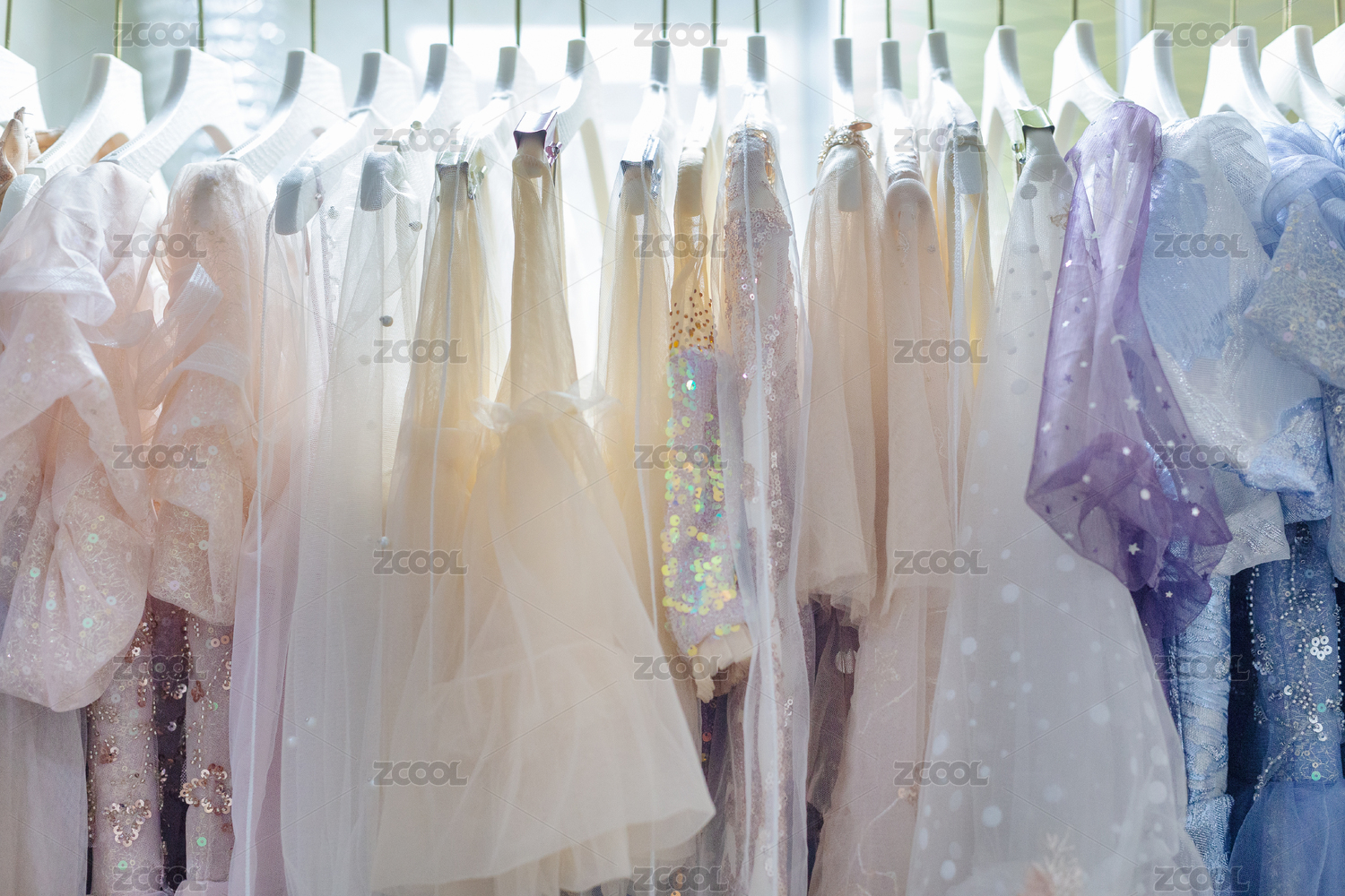 衣架上挂着的一排不同色彩的女式礼服
