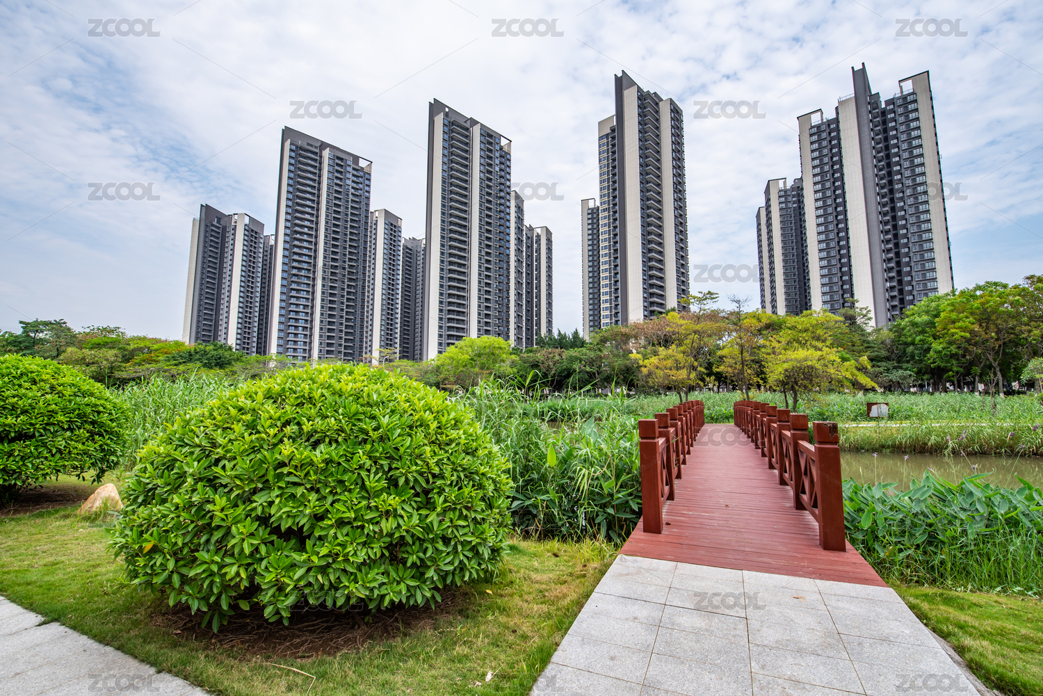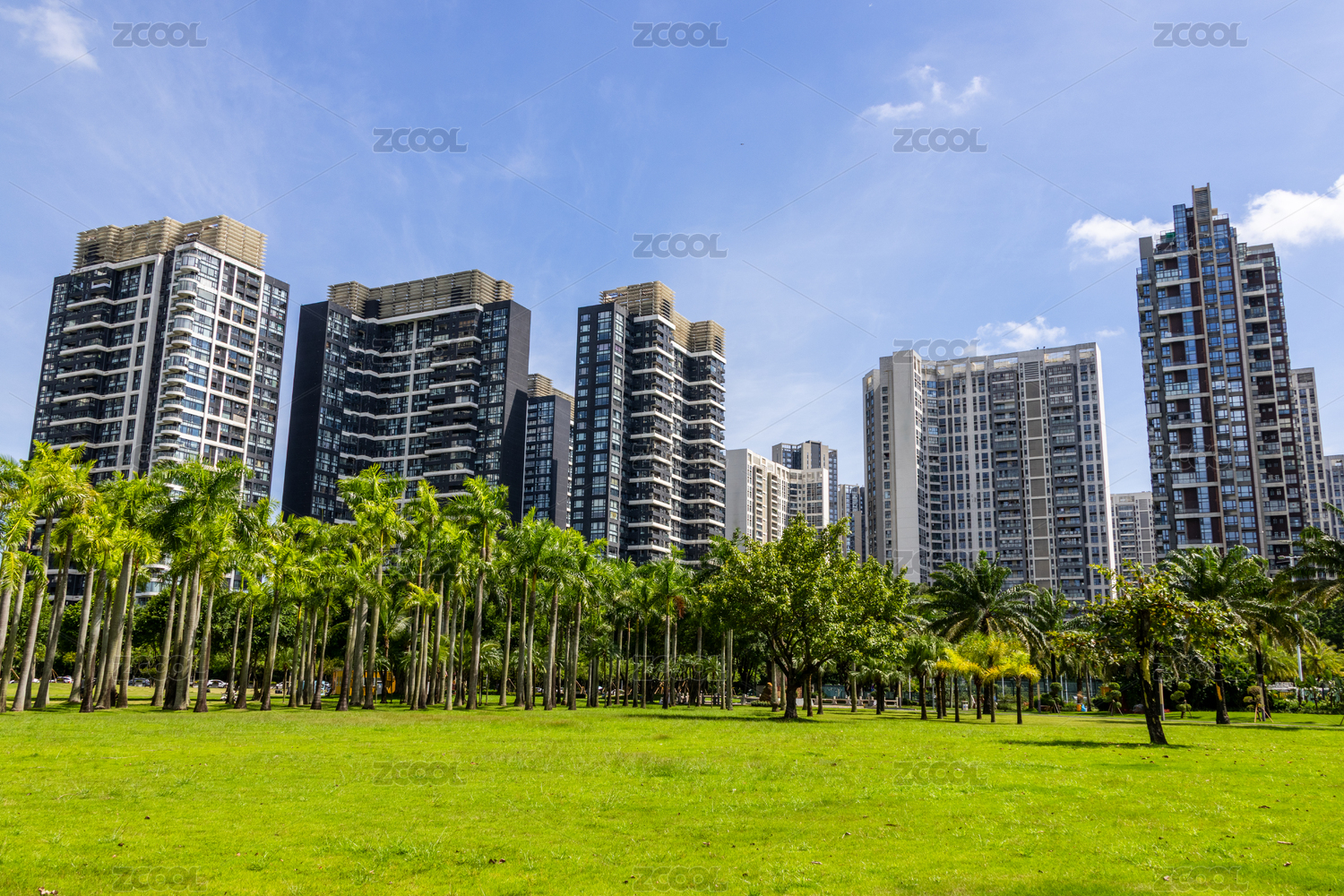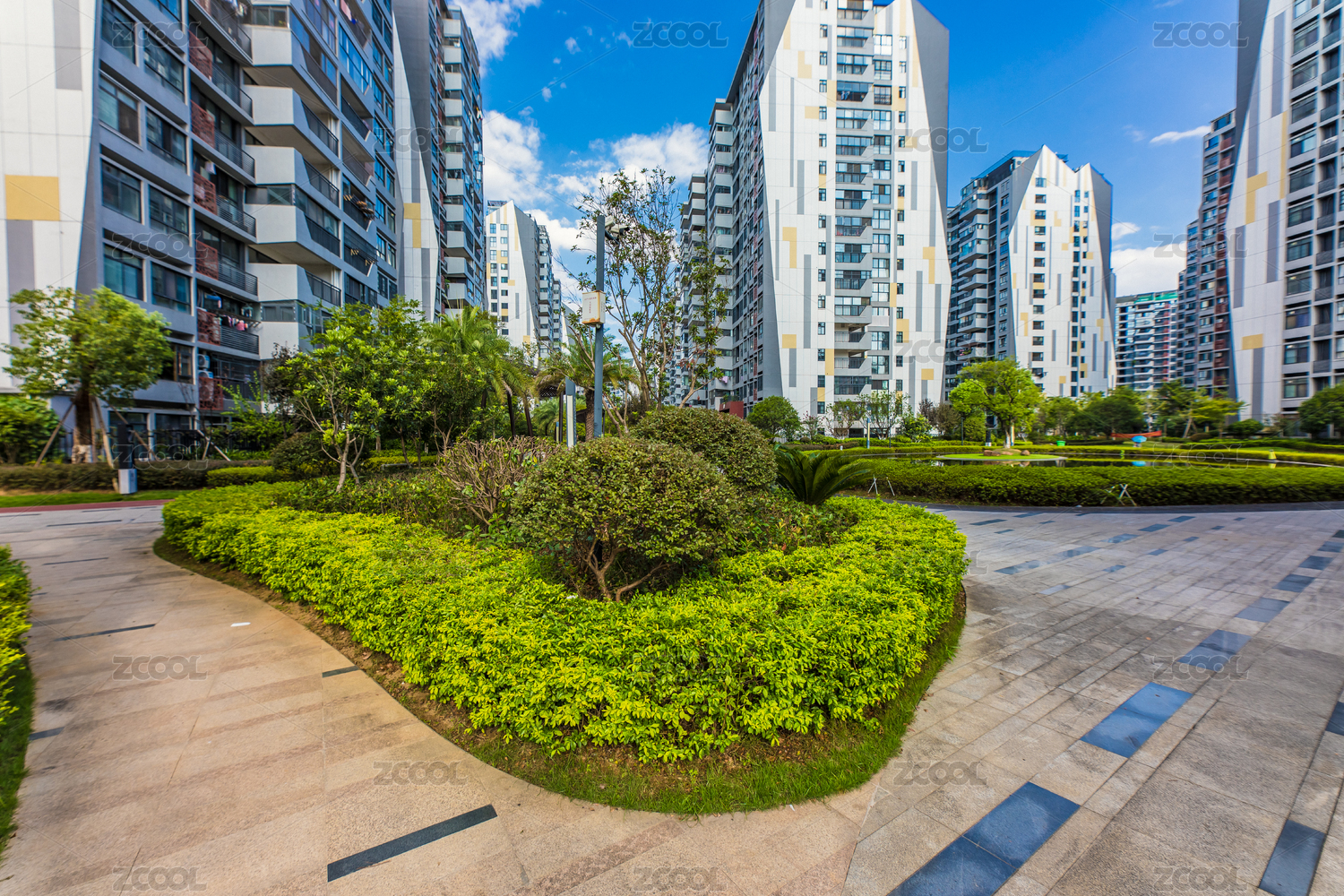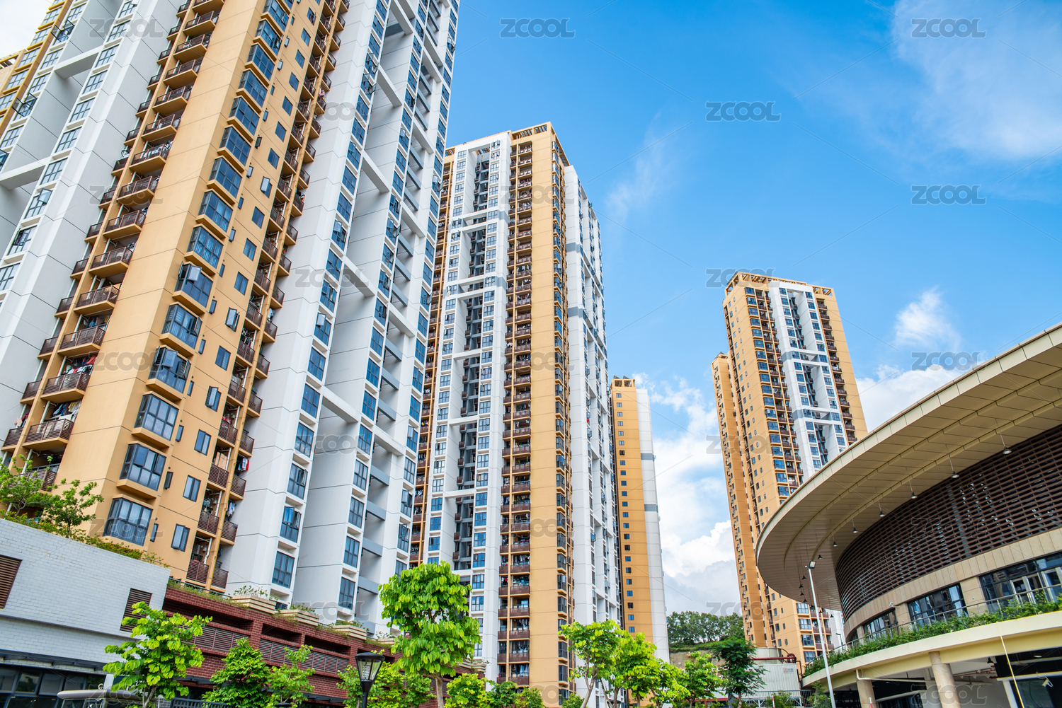 蓝天白云下的树木环绕楼盘居民楼建筑