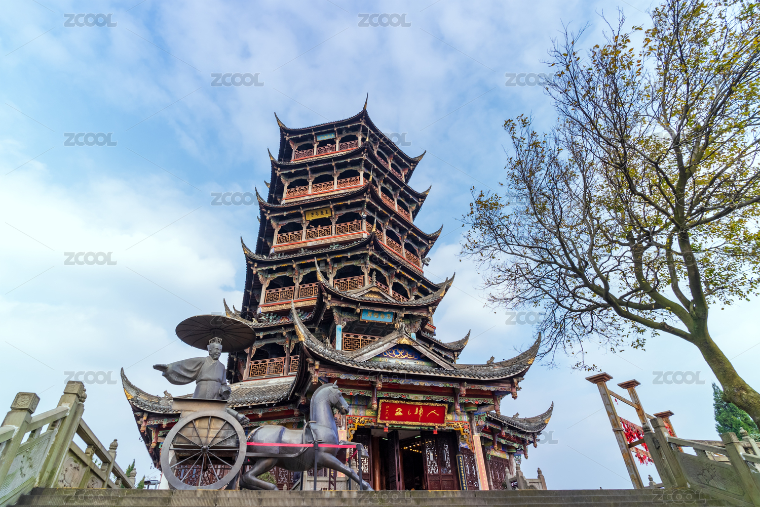 成都都江堰景区李冰巡江铜像和玉垒阁白昼