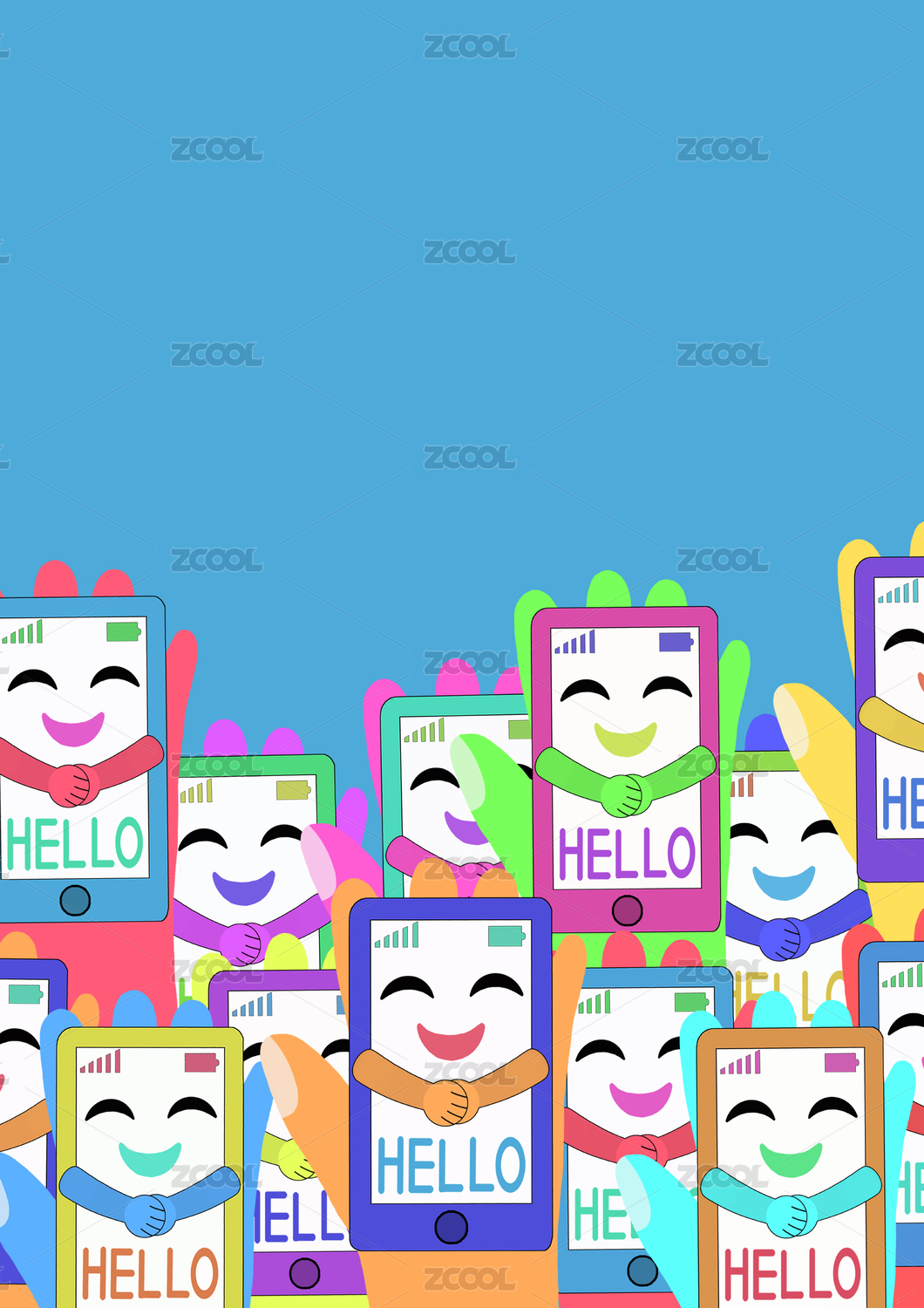 有彩色笑脸手机的科技蓝背景图