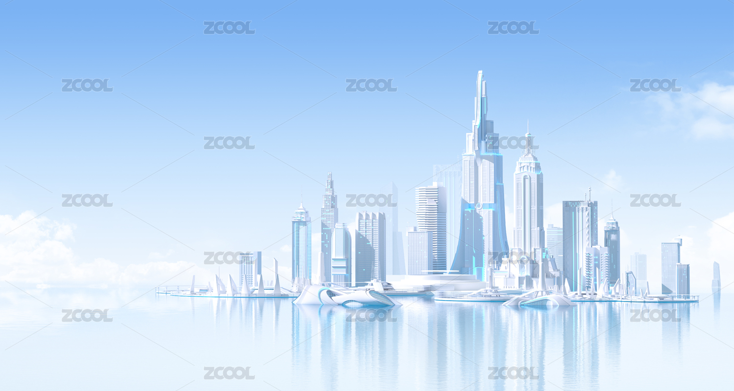 科技蓝浅色未来城市建筑蓝天白云3D场景