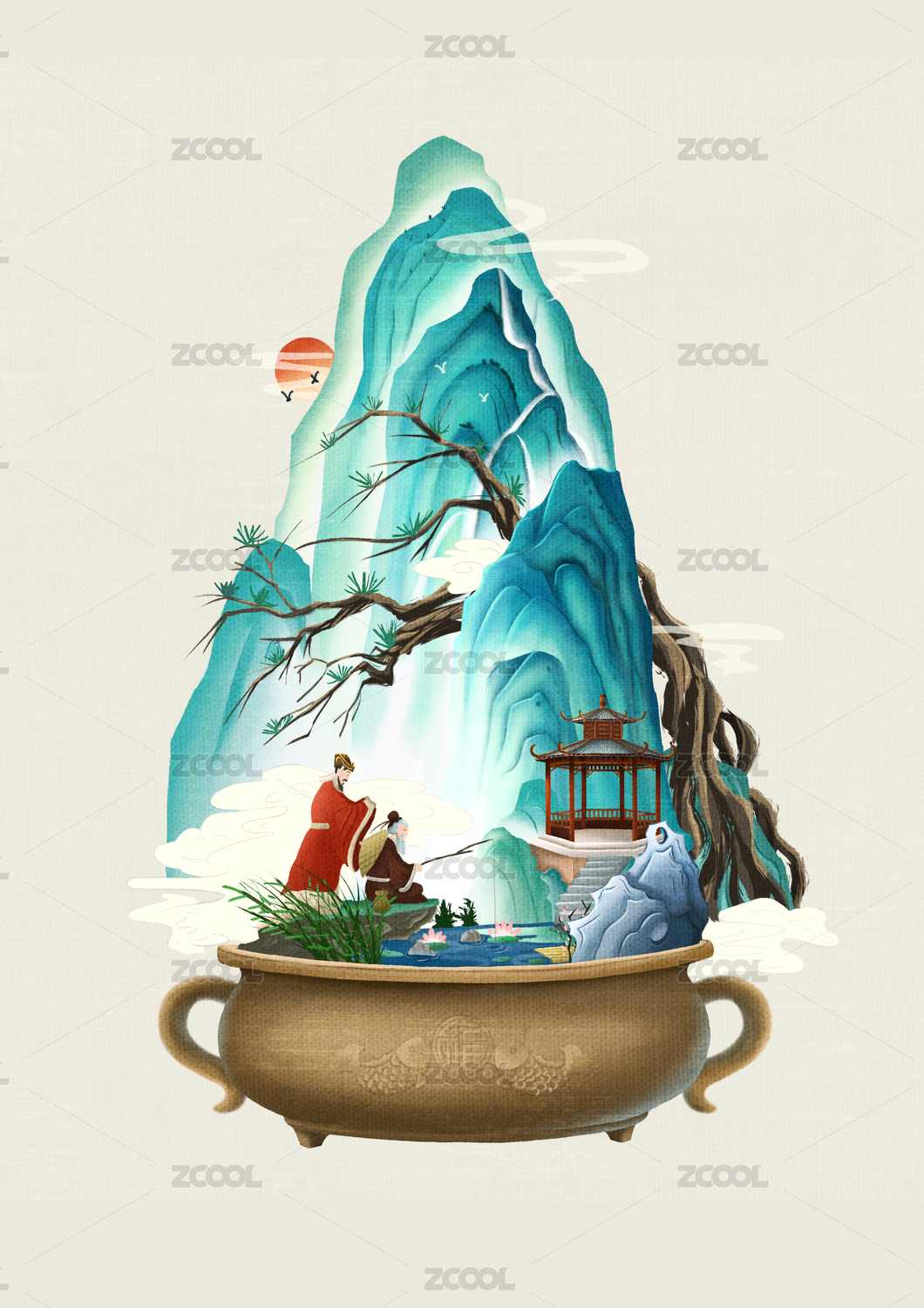 中国古风水墨微观山水场景女孩满载一船鲜花
