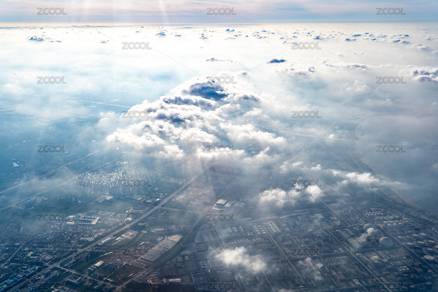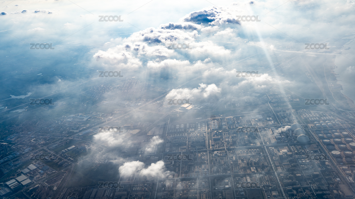 航拍云朵下的炼油化工厂景观