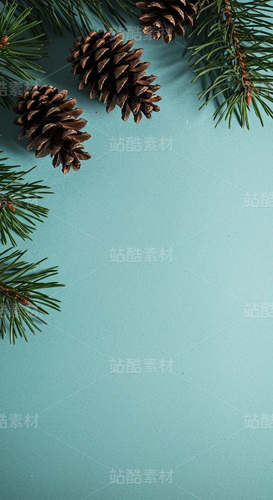 蓝绿色背景上的松针、松果和白色花朵(套图)