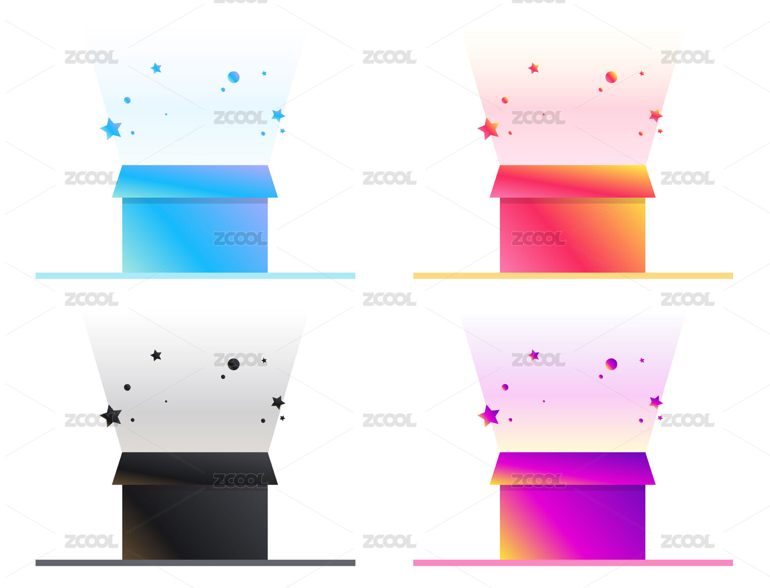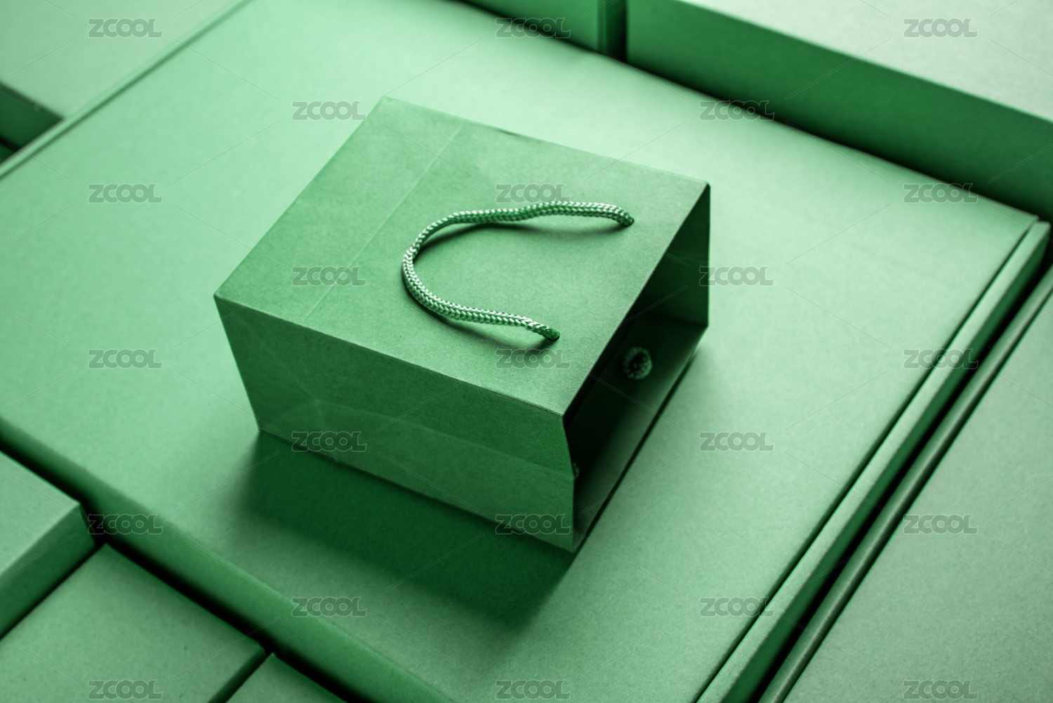 绿色纸盒子上一只购物袋,时尚炫彩消费购物概念海报