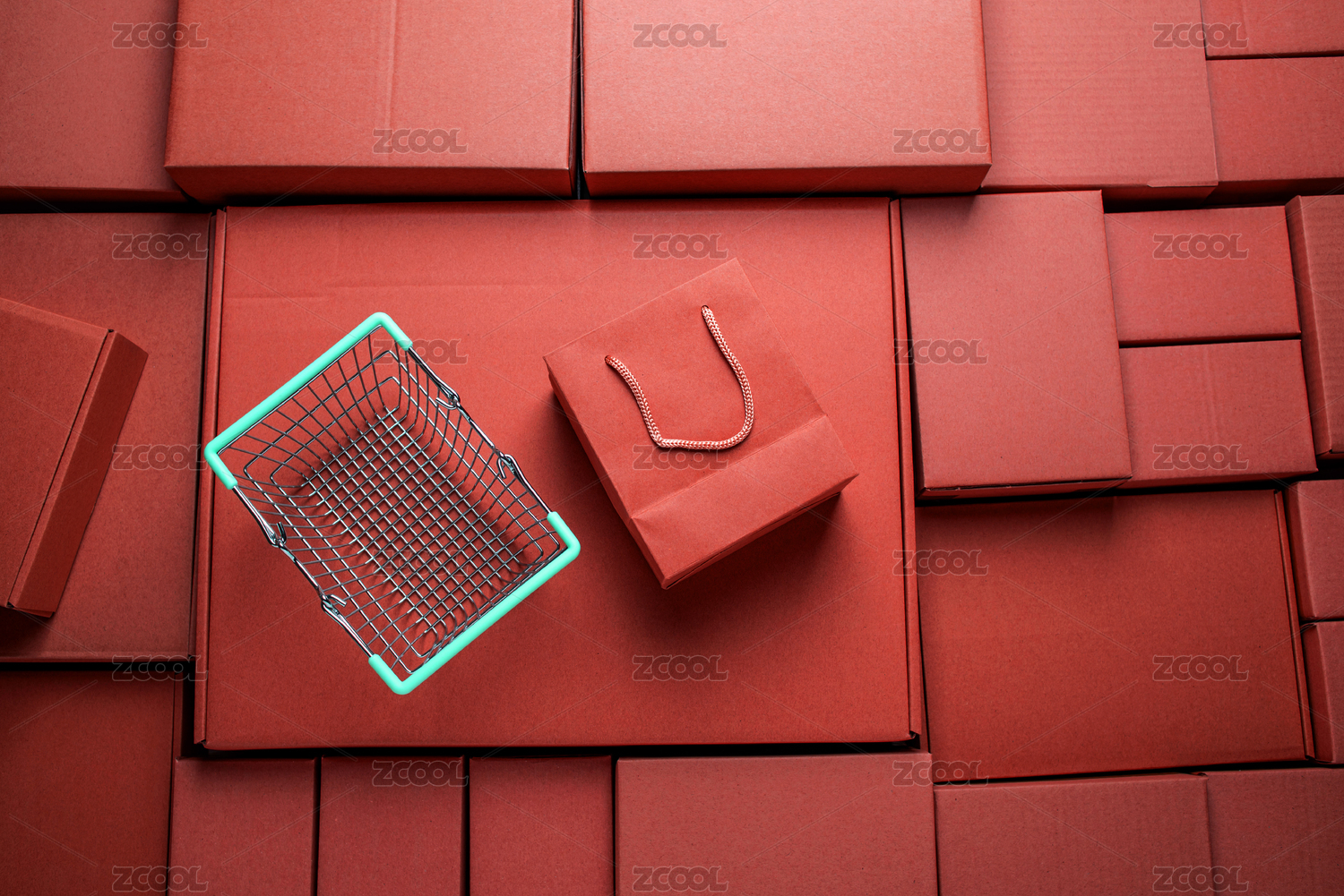 红色纸盒子和购物篮,消费购物概念时尚海报