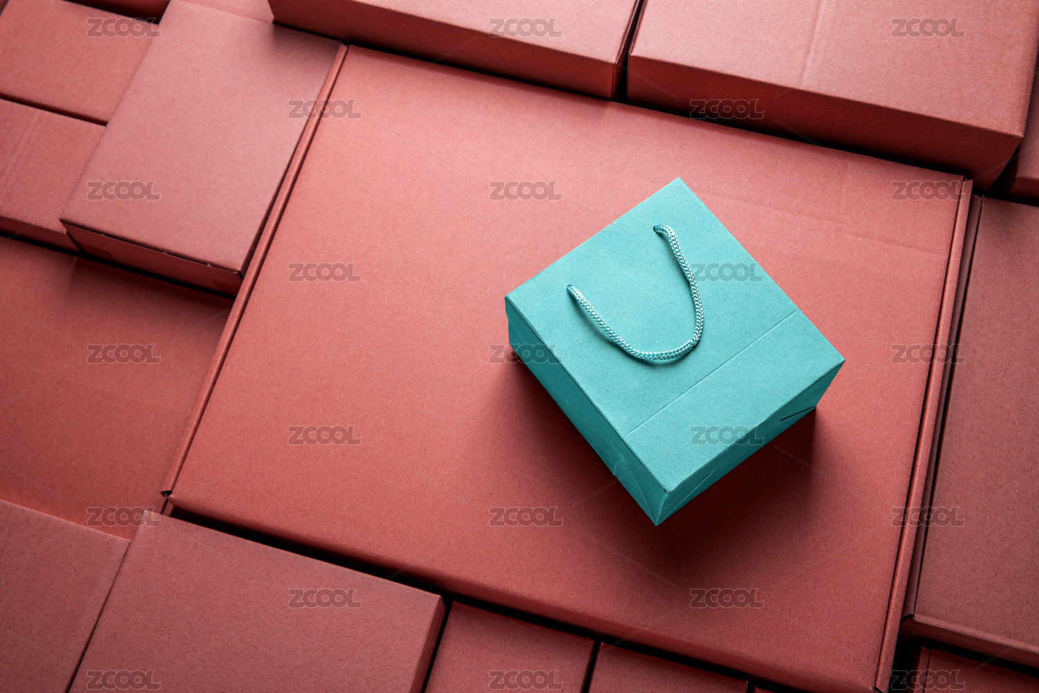 红色纸盒子上一只购物袋,时尚炫彩消费购物概念海报