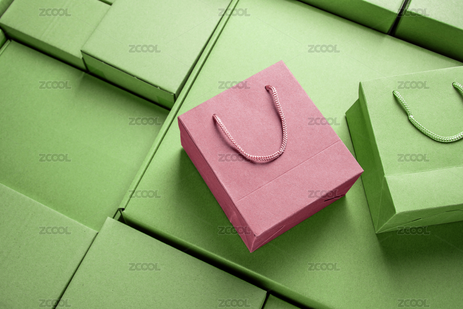 绿色纸盒子上的彩色购物袋,消费购物概念时尚海报