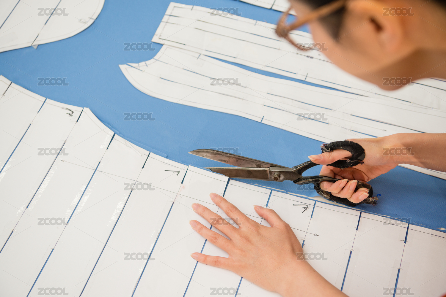 服装设计与沿手绘图稿纸布设计纸板剪的特写照片修剪物理尺寸设计的办公桌前工作新的产品格局。