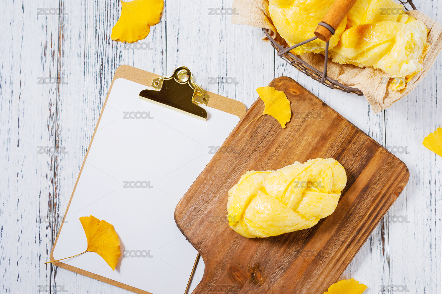 放在木白木桌上欧式椰蓉小面包和空白纸板