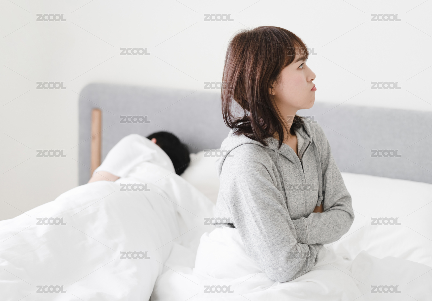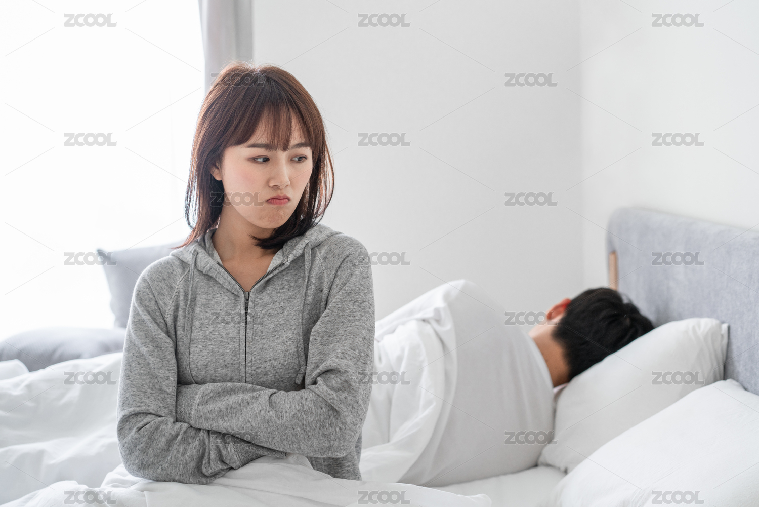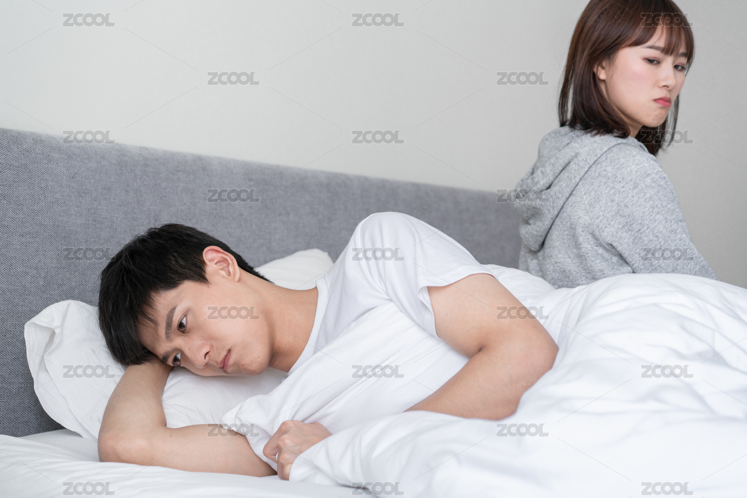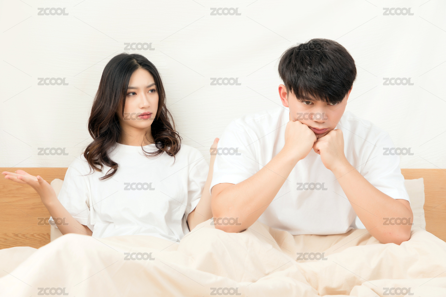 穿着白色短袖坐在床上的正在吵架的一对亚洲年轻情侣