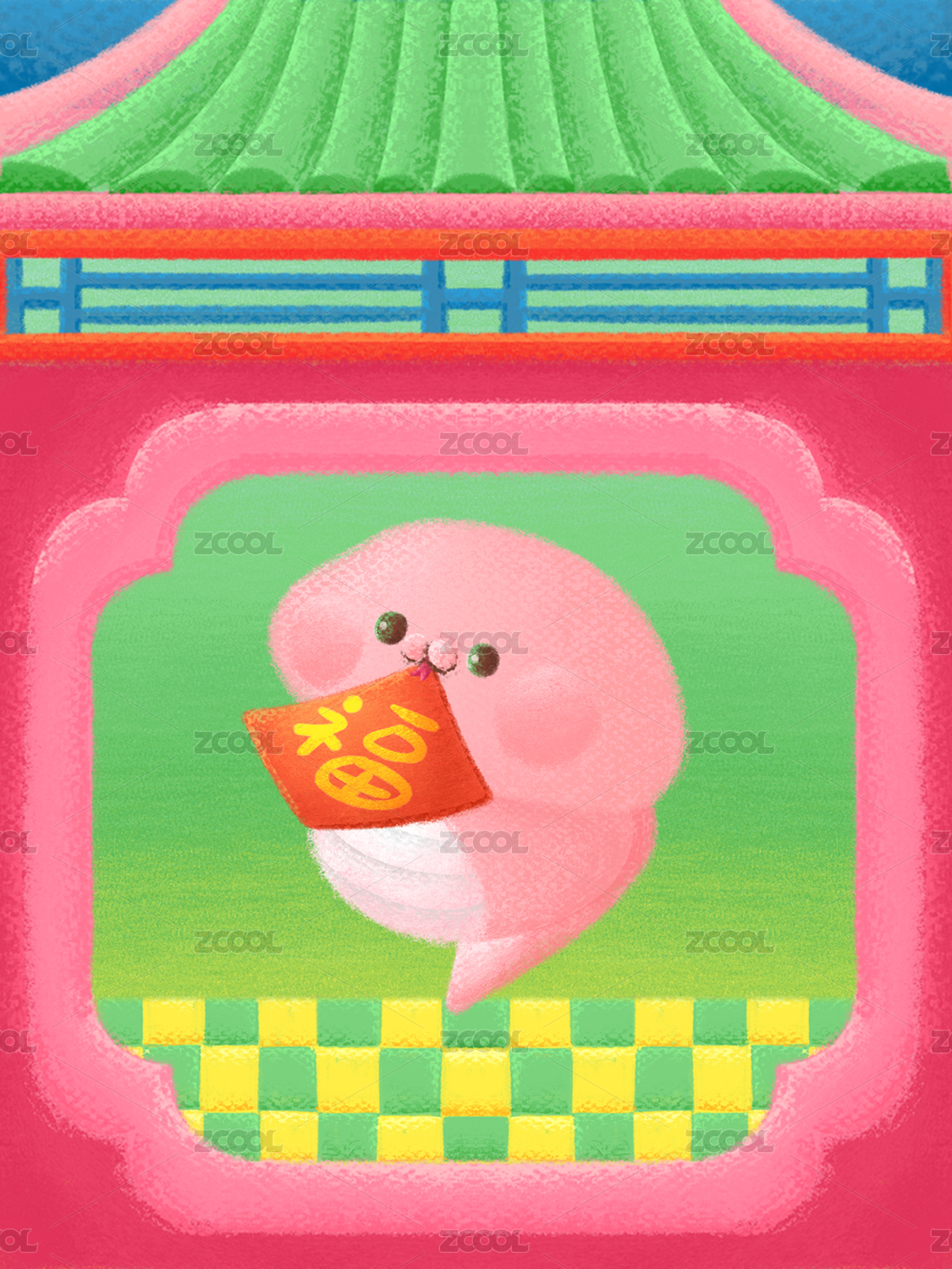 春节城市里的可爱卡通形象特色灯笼节日气氛