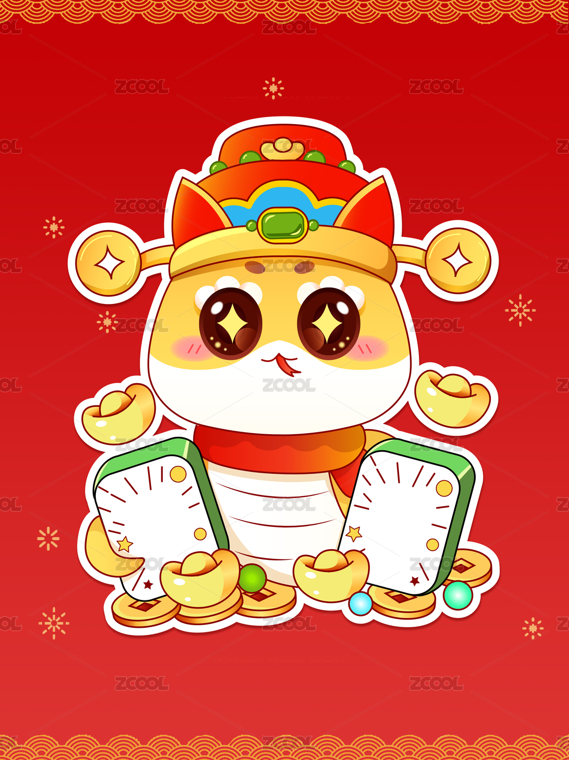 蛇年春节新年可爱卡通形象福禄元宝插画海报