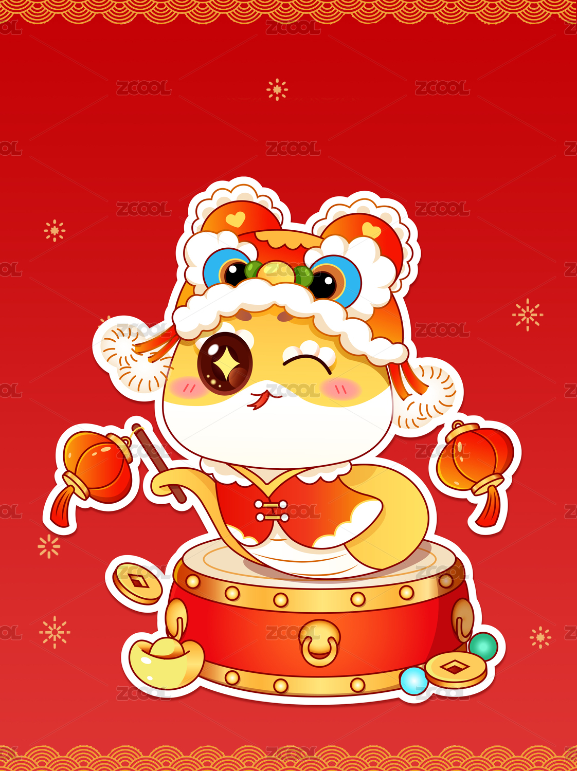 蛇年春节新年可爱卡通形象灯笼红包插画海报