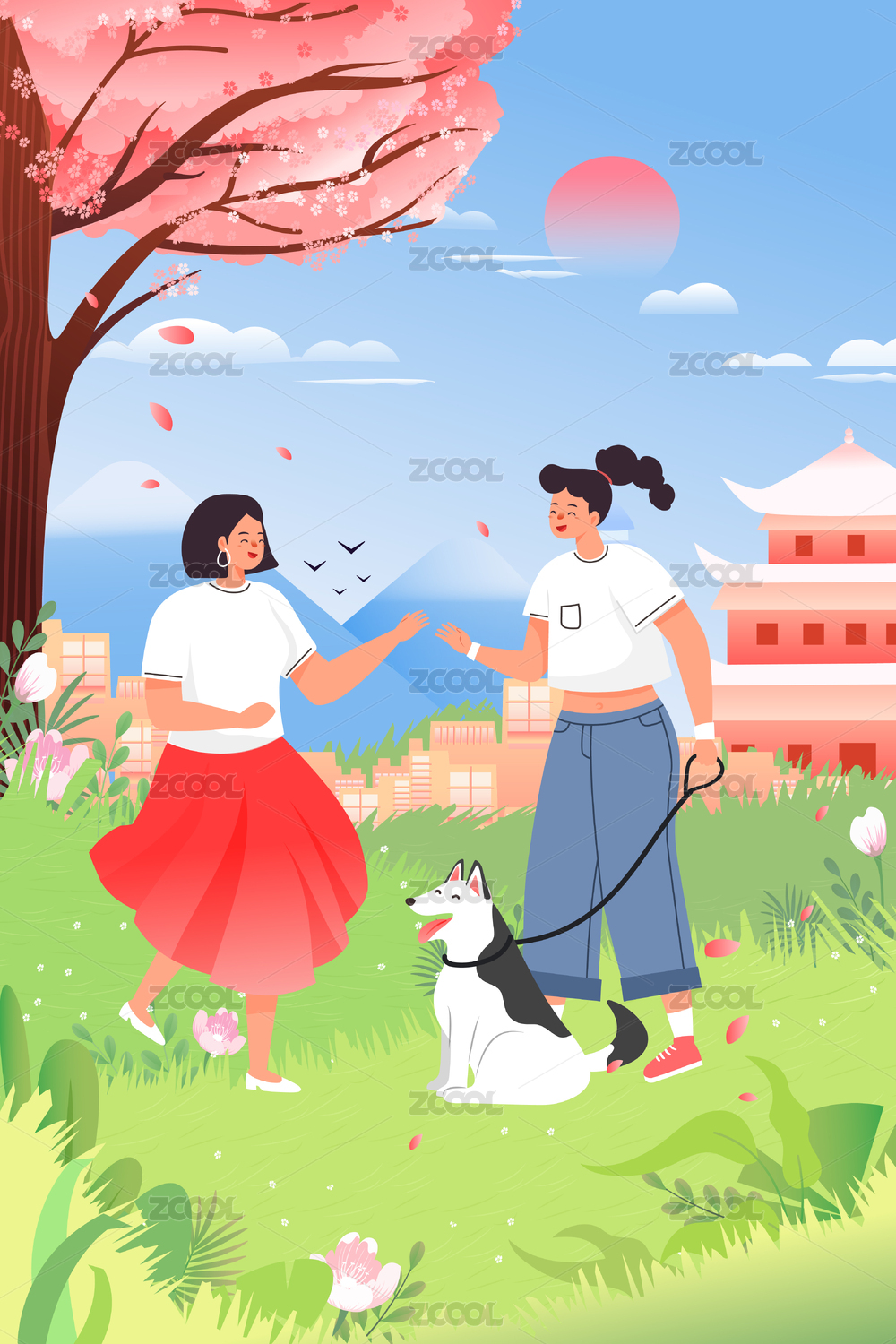卡通春季踏青出游旅行城市风景矢量背景插画