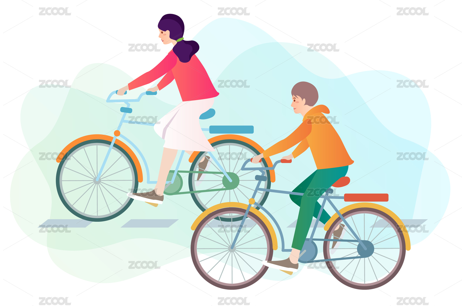 卡通立春出行踏青骑自行车风景背景矢量插画