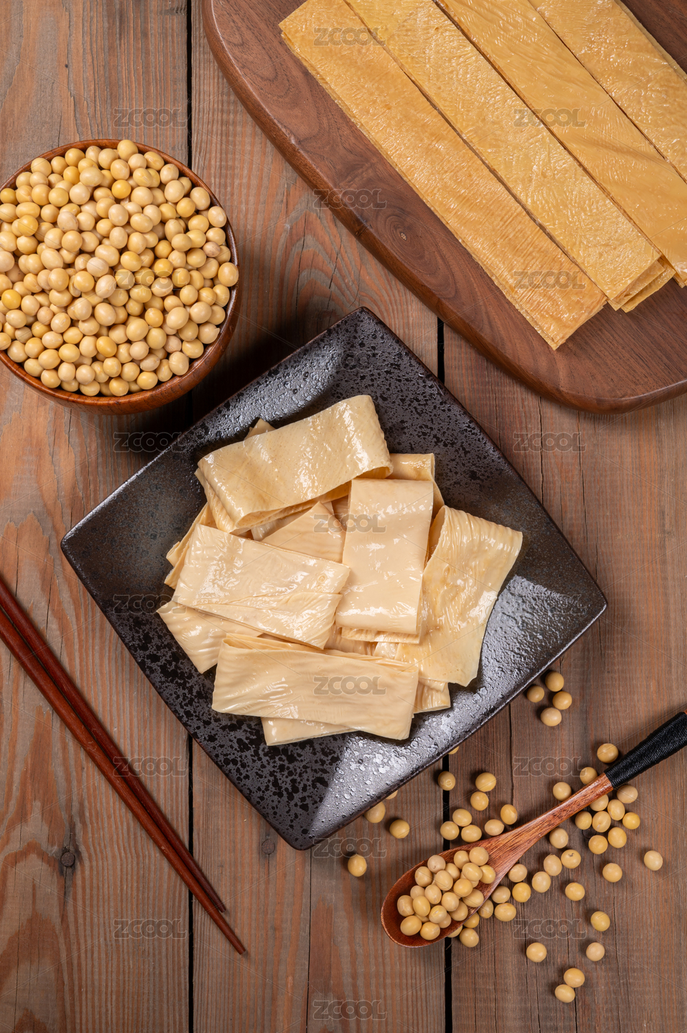 木桌上的豆皮和黄豆