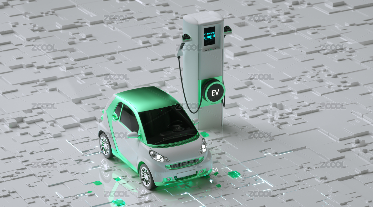 白色汽车插着充电桩充电发出绿色光