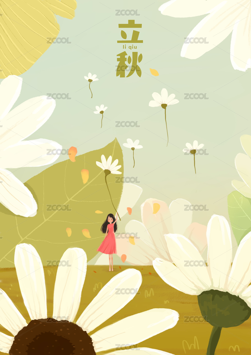 秋季立秋花卉女孩温馨场景创意插画