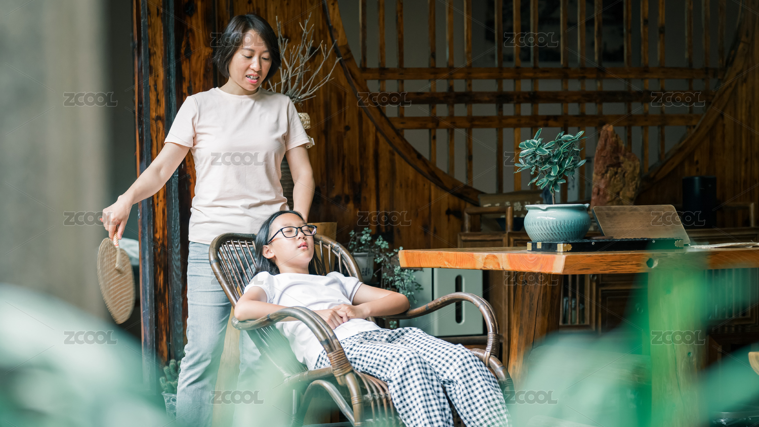 女子为椅上女孩扇风的温馨场景