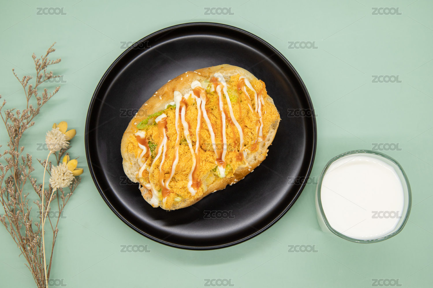 绿色背景一块肉松芝士面包