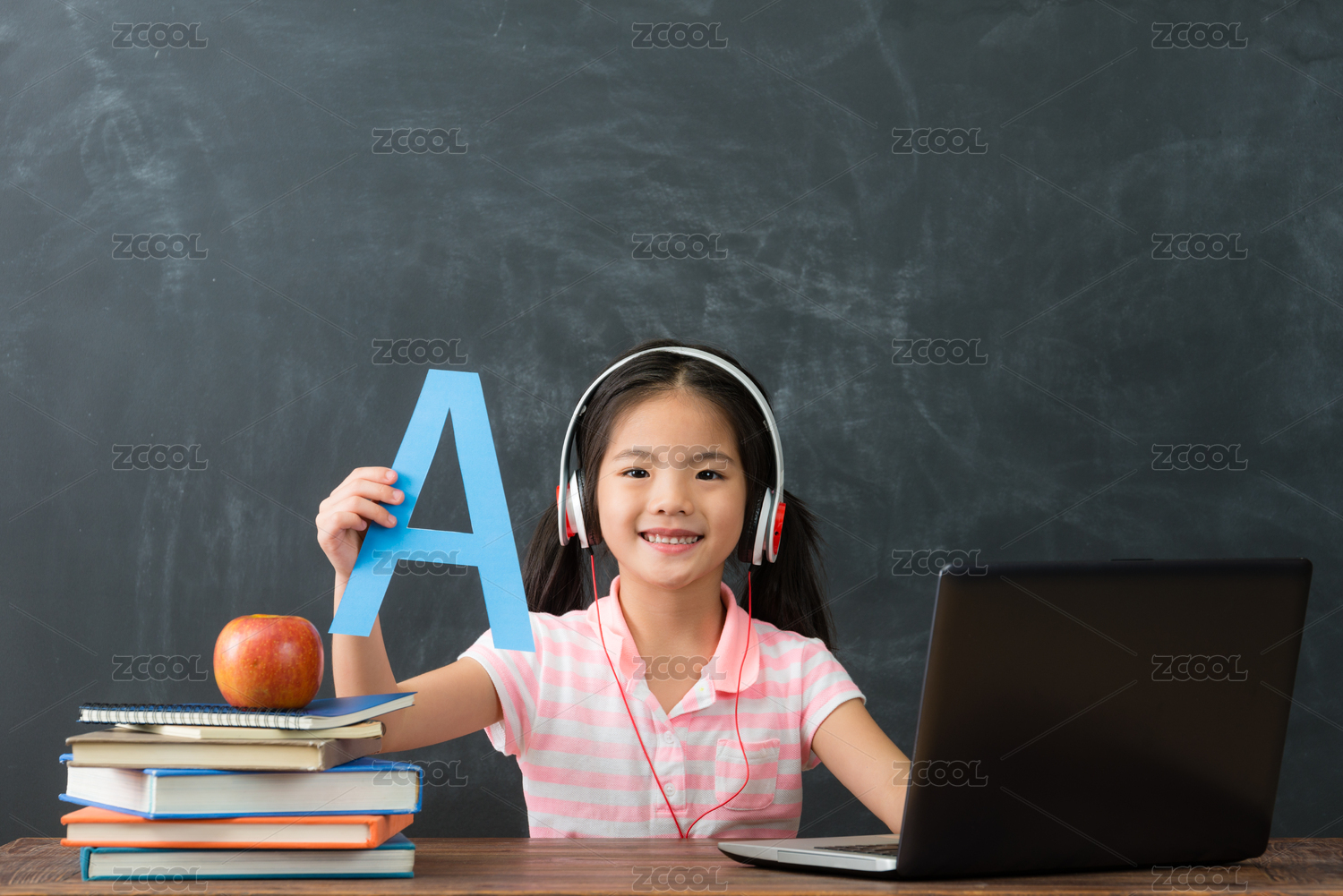 开朗的年轻小女孩的儿童在使用笔记本电脑用耳机通过在线电子学习系统在黑板背景研究。