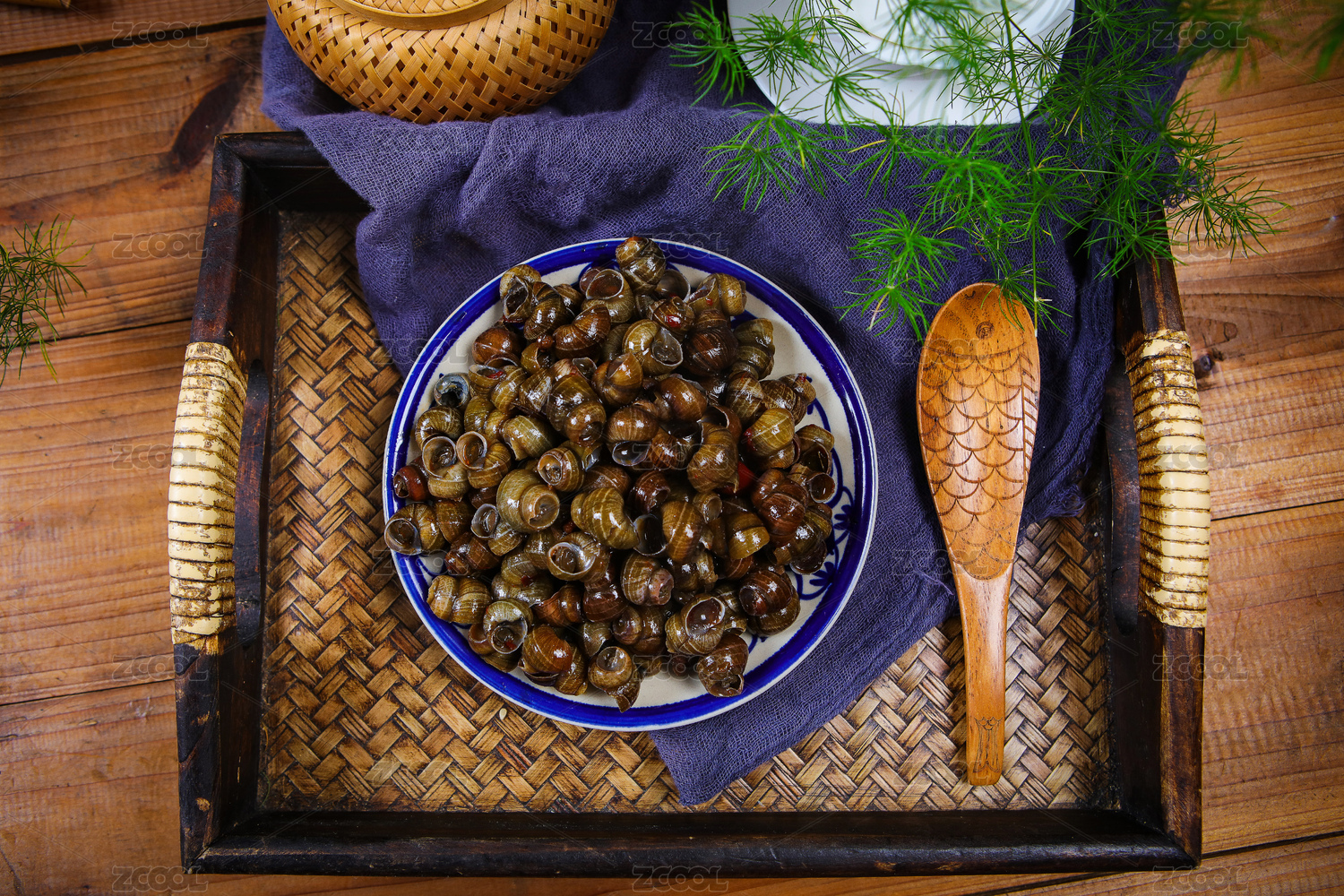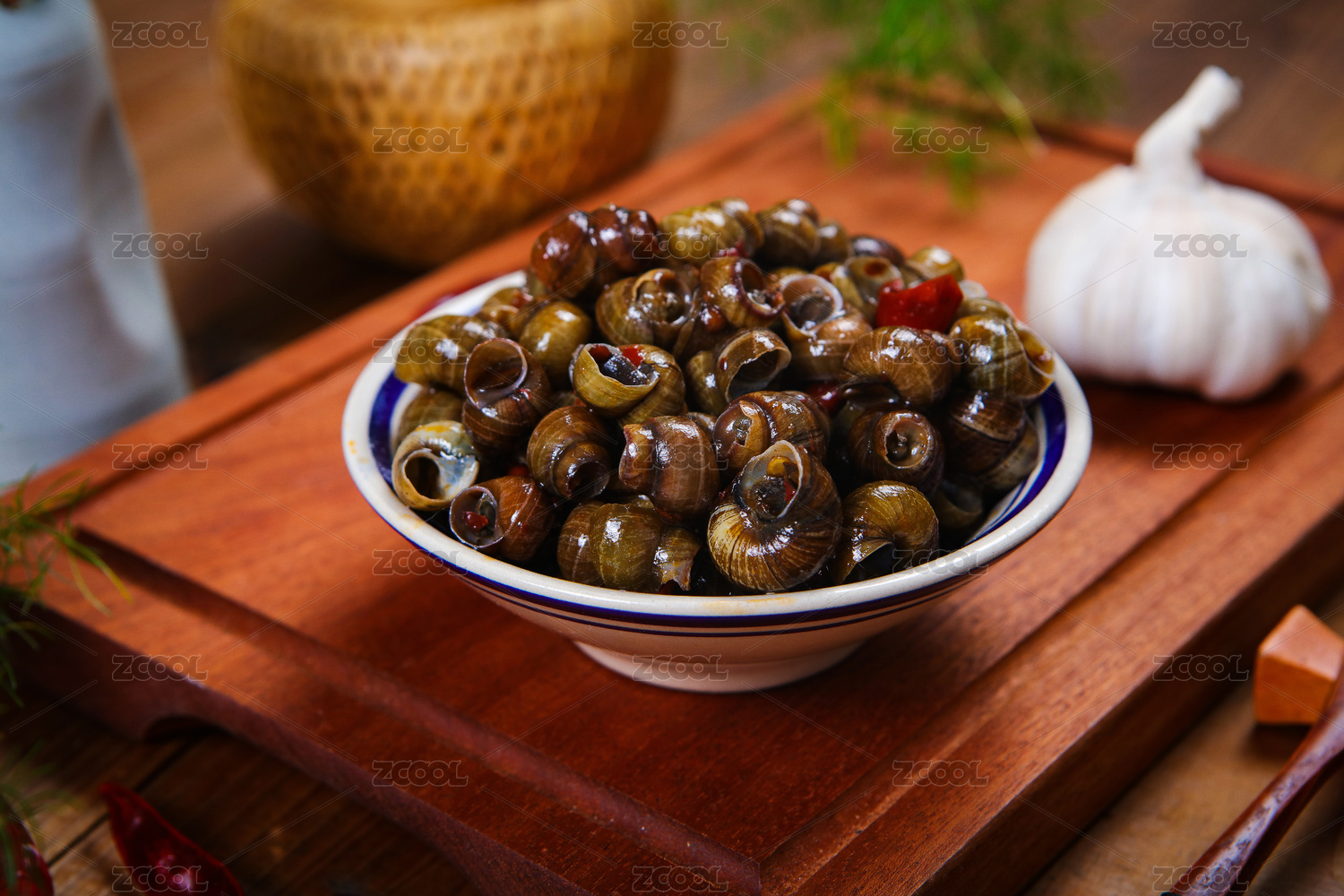 木板上放在蓝色盘子里面的炒田螺