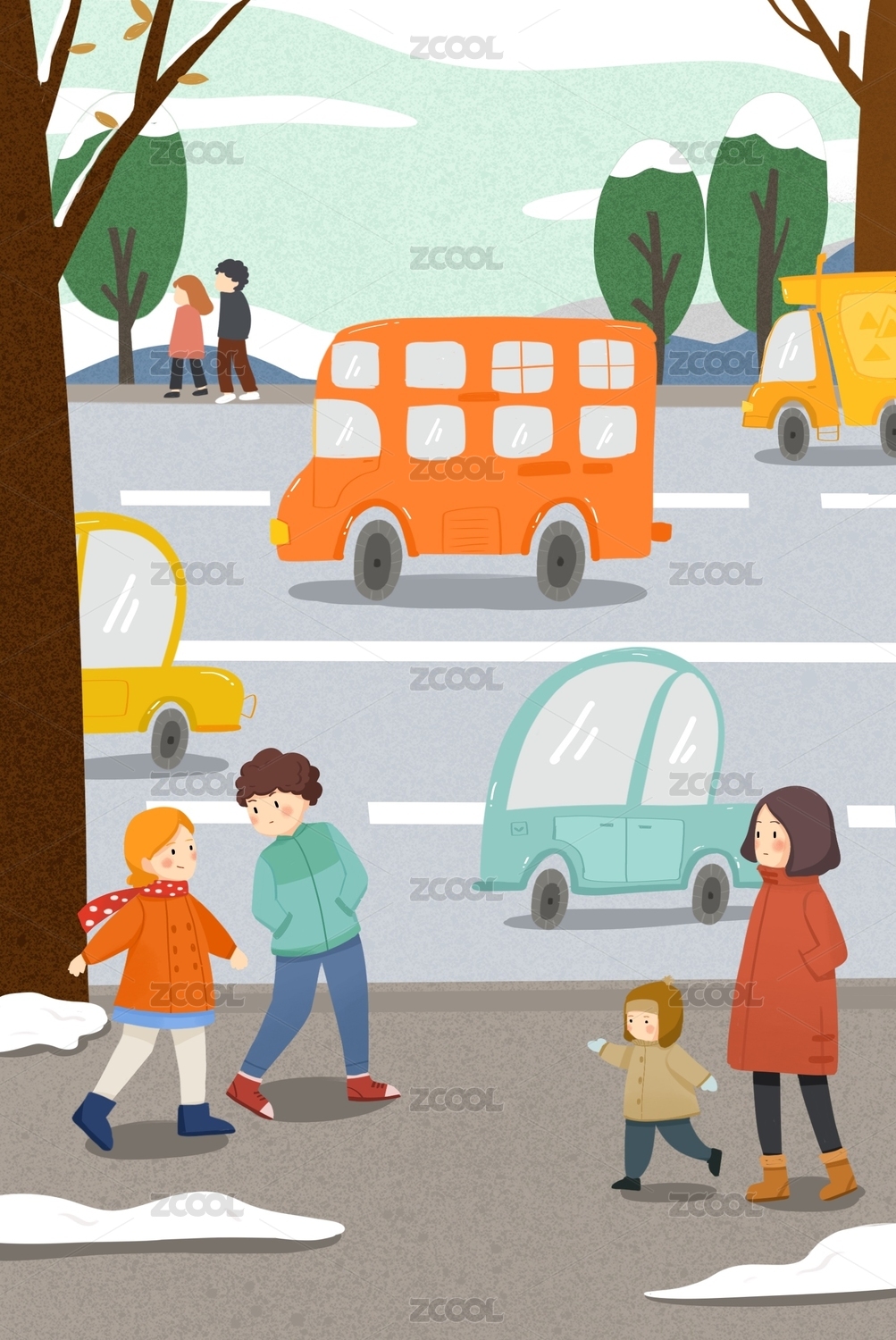清新可爱交通汽车行人遵守交通秩序插画