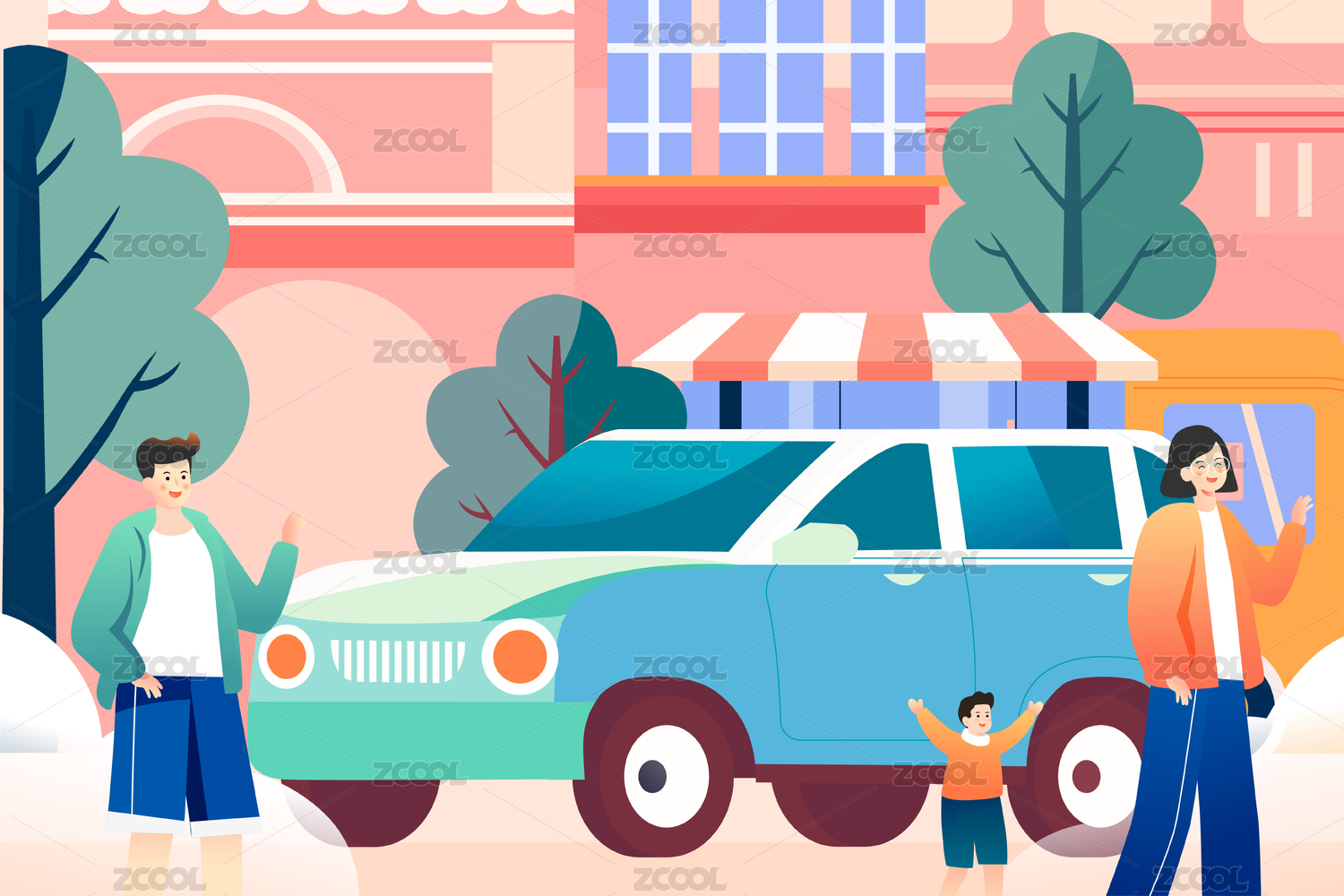 五一劳动节一家人城市旅行街道繁华商场插画