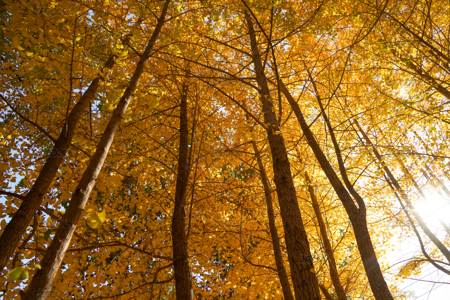 金秋时节阳光透过金黄树叶
