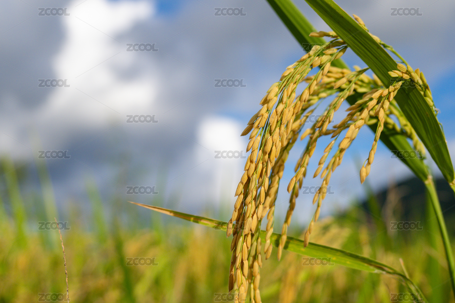 金黄色的稻穗在蓝天白云下随风摇曳