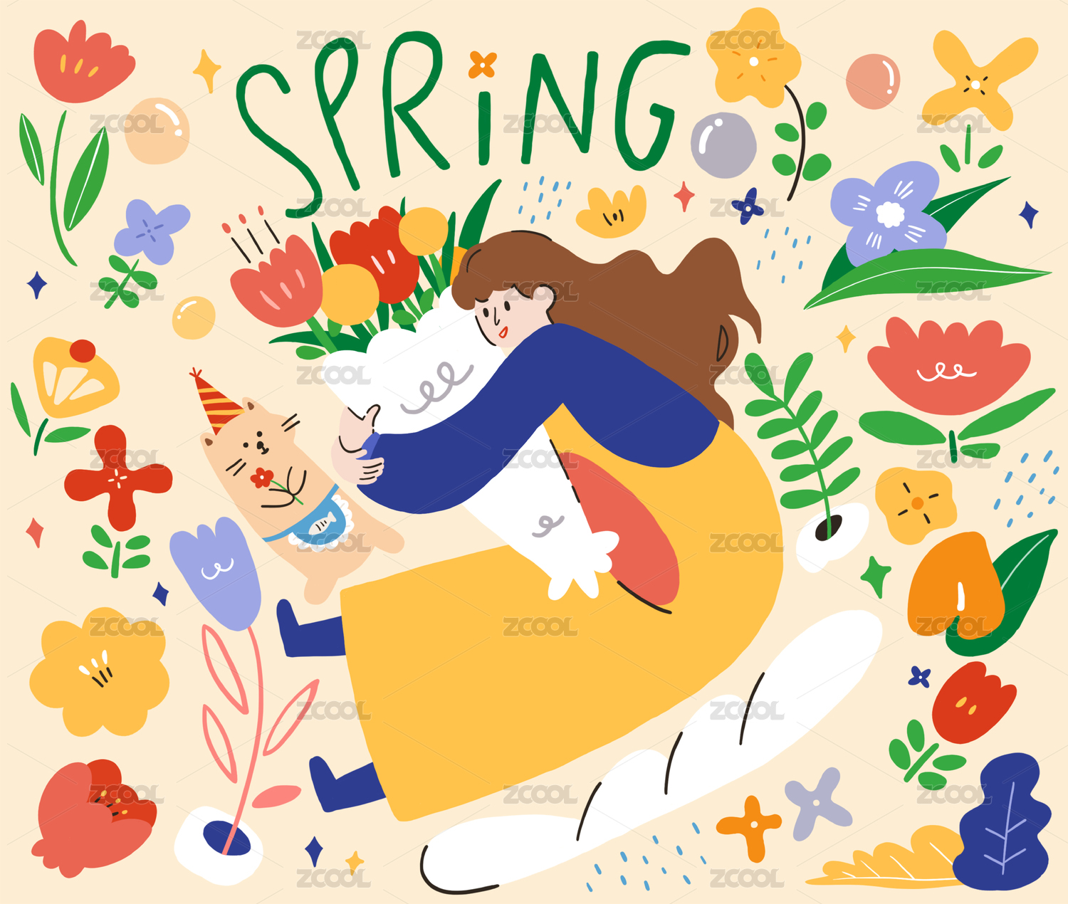 春天花园里抱着花束的女孩
