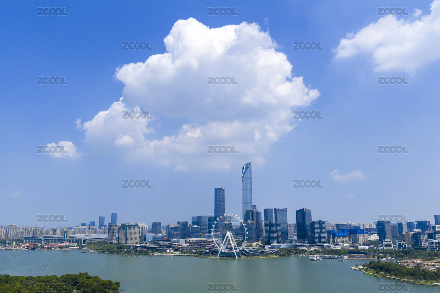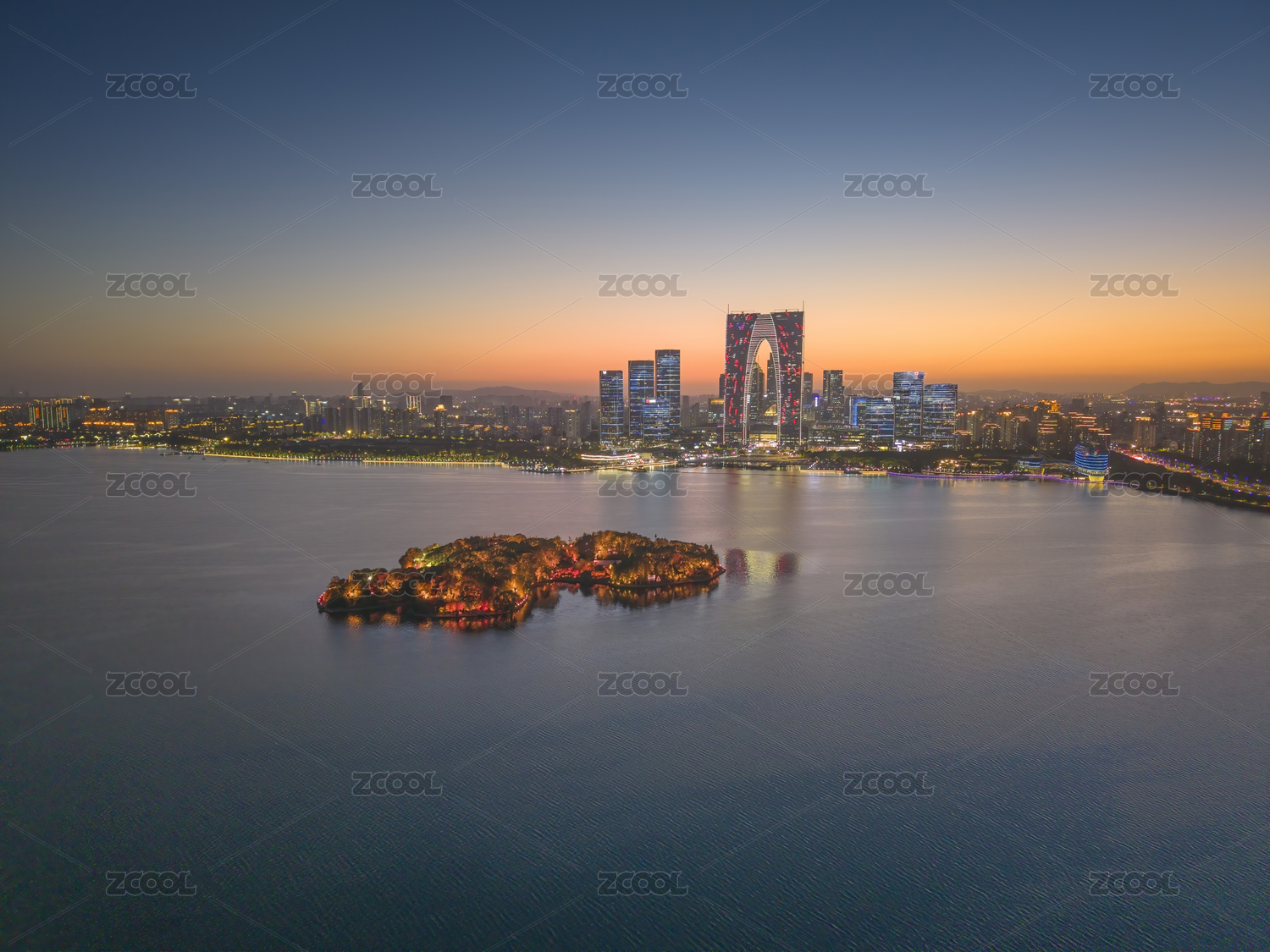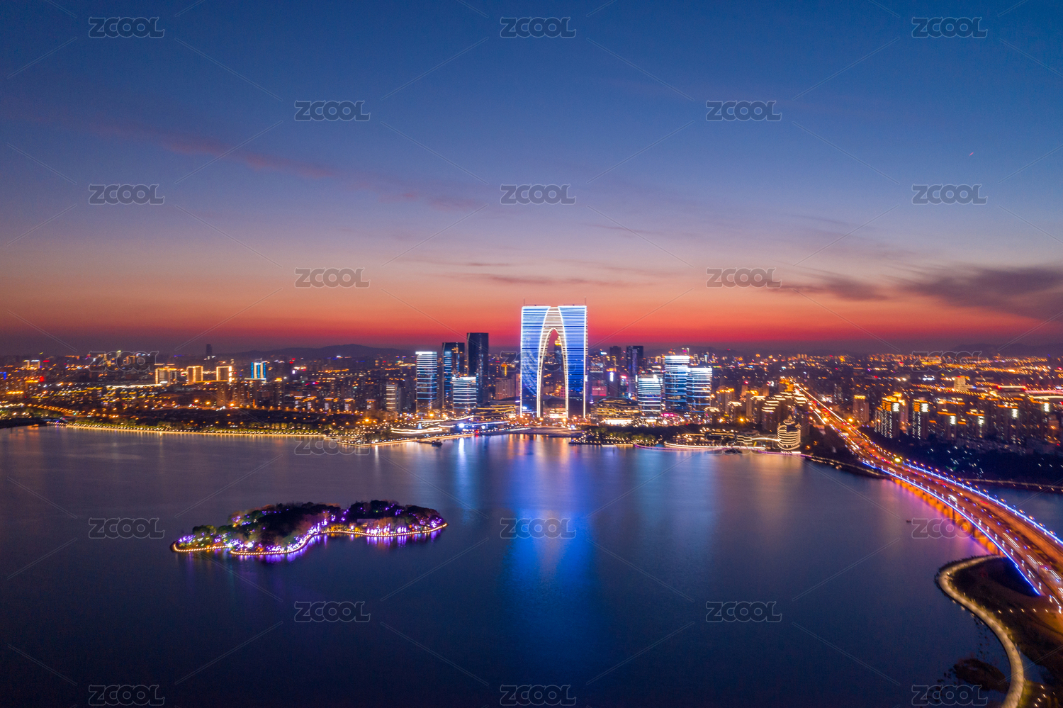 航拍苏州金鸡湖滨水城市CBD夜景风光