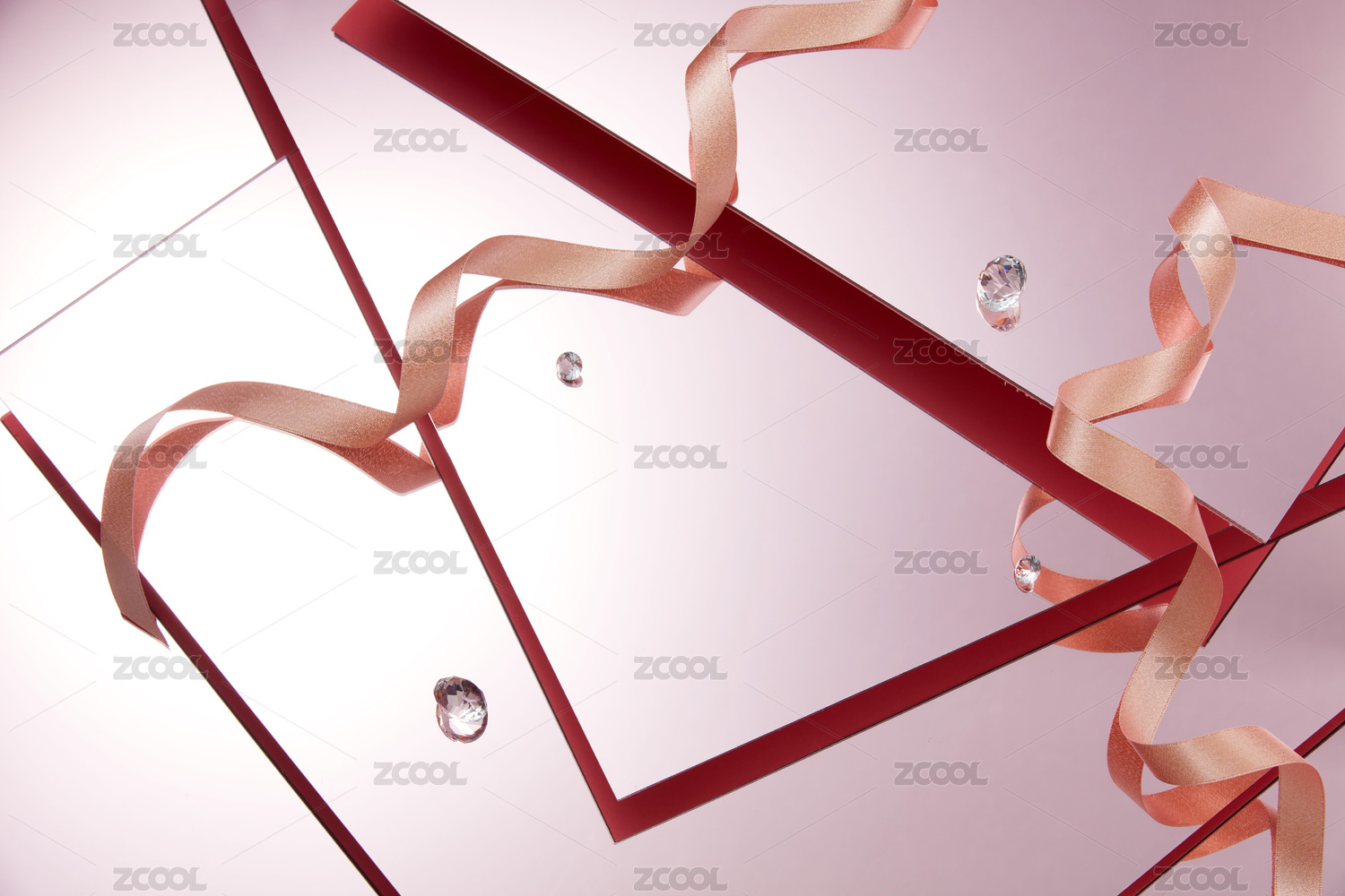粉色丝带和钻石在层层叠加的粉色镜面背景上